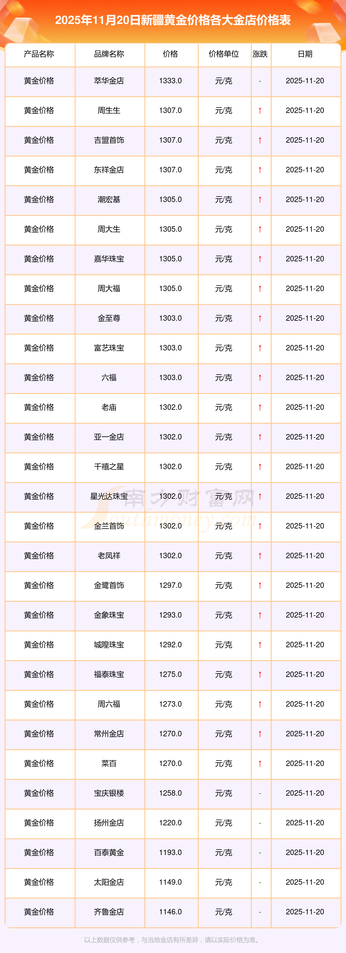 2025年11月20日,新疆菜百、菜百、菜百、菜百、菜百、菜百、菜百、菜百、老廟、老廟、老廟等各大金店品牌黃金價格今日價格行情最新來了:菜百540.0元/克、菜百540.0元/克、菜百545.0元/克、菜百552.0元/克、菜百1060.0元/克、菜百392.0元/克、菜百1270.0元/克、菜百11.8元/克、老廟1302.0元/克、老廟600.0元/克、老廟1257.0元/克。