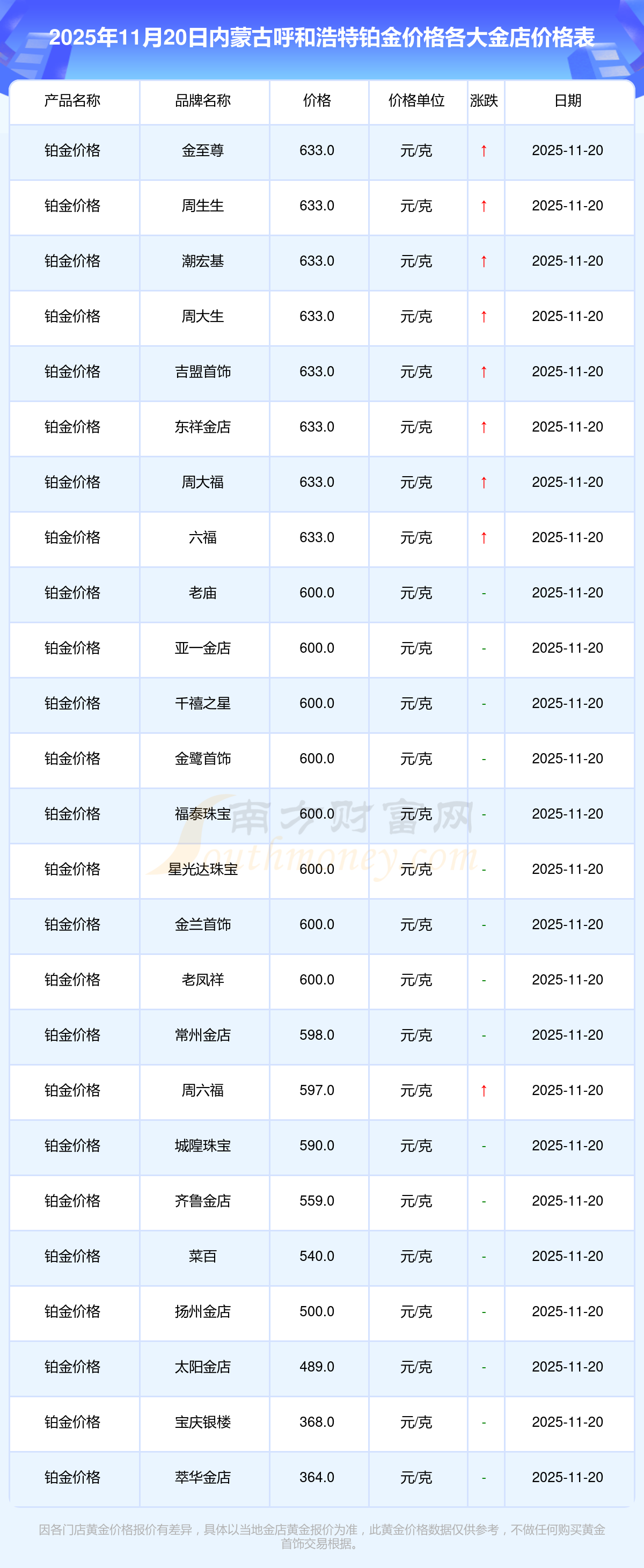 金飾在多家門店的售價是多少?2025年11月20日內(nèi)蒙古呼和浩特各金店鉑金價格表來了