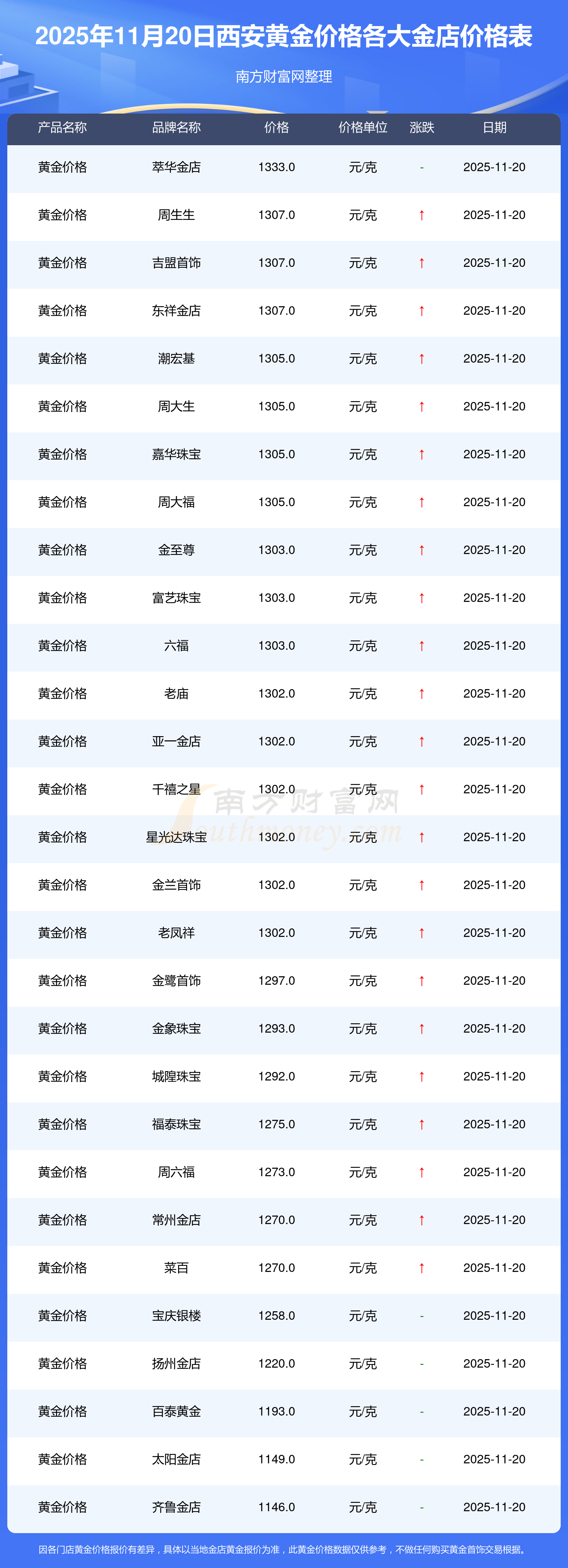 今天是2025年11月20日,西安菜百、菜百、菜百、菜百、菜百、菜百、菜百、菜百、老廟、老廟、老廟等各大金店品牌黃金價格最新價格行情是這樣的:菜百540.0元/克、菜百540.0元/克、菜百545.0元/克、菜百552.0元/克、菜百1060.0元/克、菜百392.0元/克、菜百1270.0元/克、菜百11.8元/克、老廟1302.0元/克、老廟600.0元/克、老廟1257.0元/克。