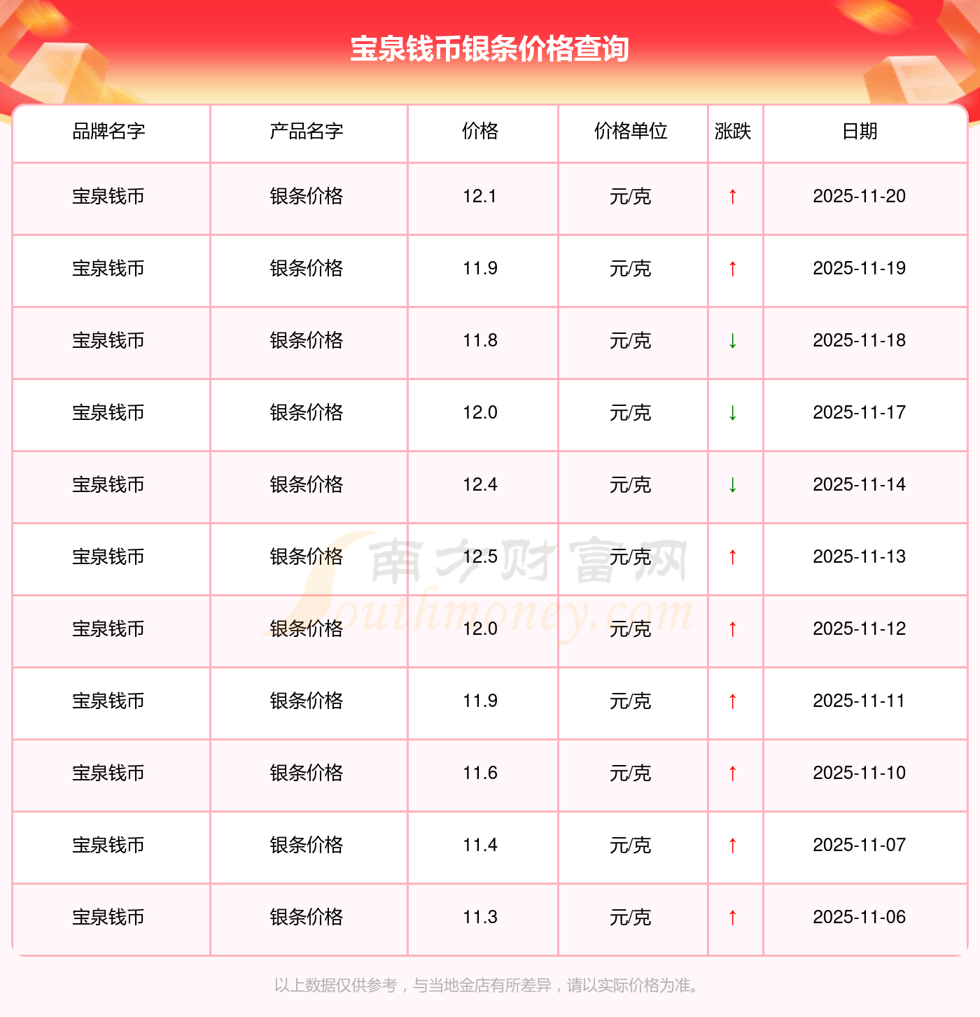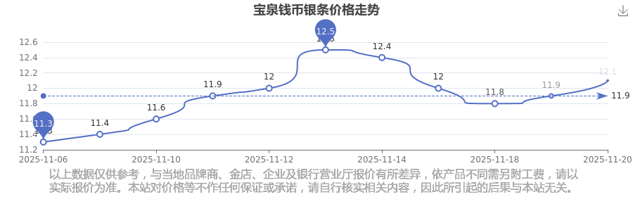 12.1元/克的價(jià)格,是寶泉錢(qián)幣今日 銀條價(jià)格的最新行情。