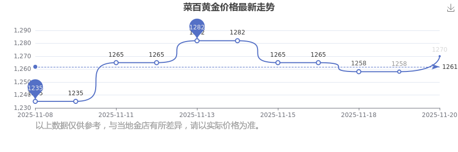 今天黃金價(jià)位怎樣呢?現(xiàn)在每克黃金賣多少錢?黃金是一種優(yōu)良的導(dǎo)電導(dǎo)熱材料,具有良好的導(dǎo)熱特性。黃金常用于電子工業(yè)中的特殊電路設(shè)計(jì),因其化學(xué)穩(wěn)定性高、抗氧化性強(qiáng),可制作高精度電子元件。2025年11月20日菜百黃金價(jià)格最新為1270.0元/克。