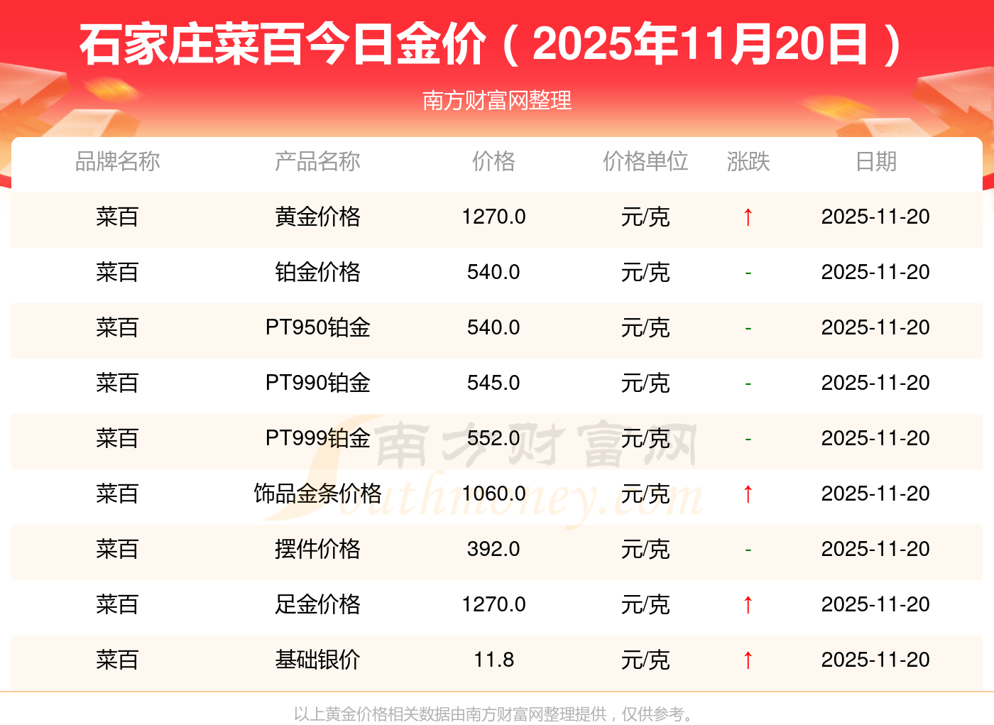 今日黃金價格查詢_現(xiàn)在金價黃金一克多少錢,黃金價格是多少錢一克?2025年11月20日石家莊菜百今日價格:鉑金價格540.0元/克,PT950鉑金540.0元/克,PT990鉑金545.0元/克,PT999鉑金552.0元/克,飾品金條價格1060.0元/克,擺件價格392.0元/克,足金價格1270.0元/克,基礎(chǔ)銀價11.8元/克,黃金價格1302.0元/克,鉑金價格600.0元/克,金條/金塊價格1257.0元/克。