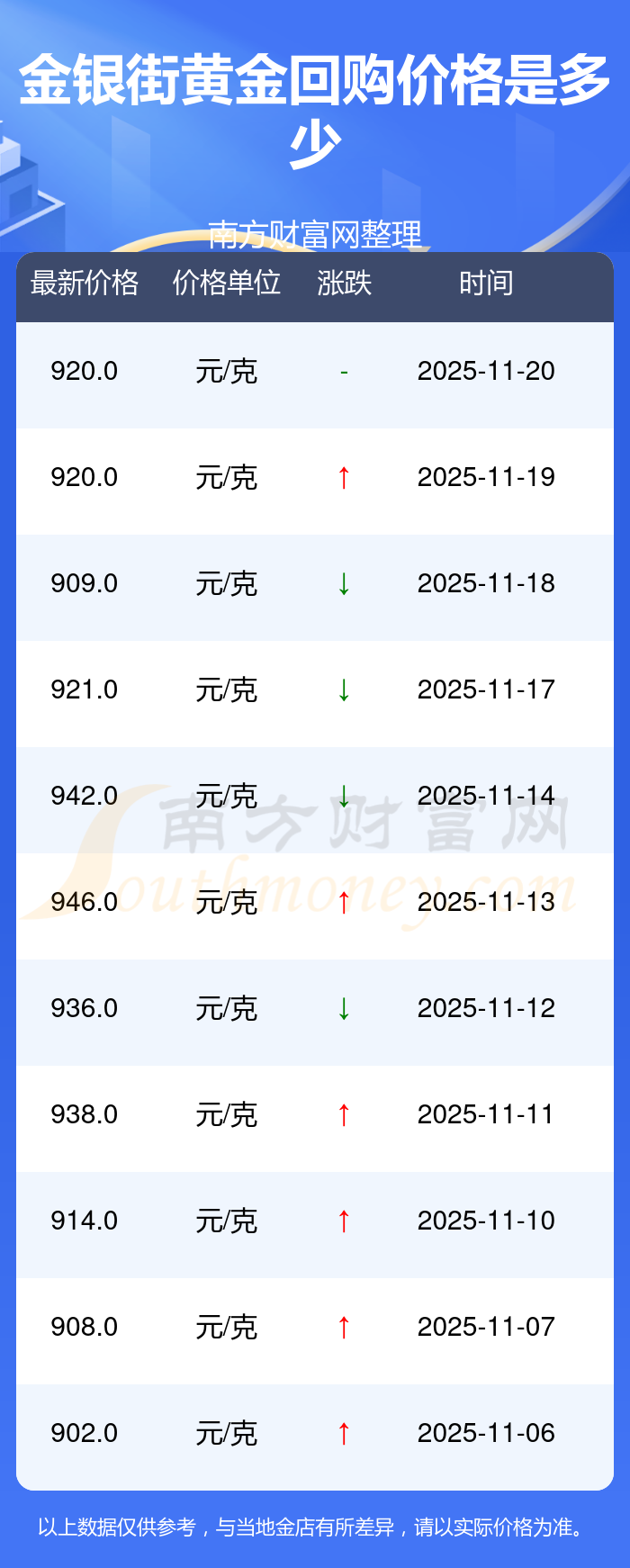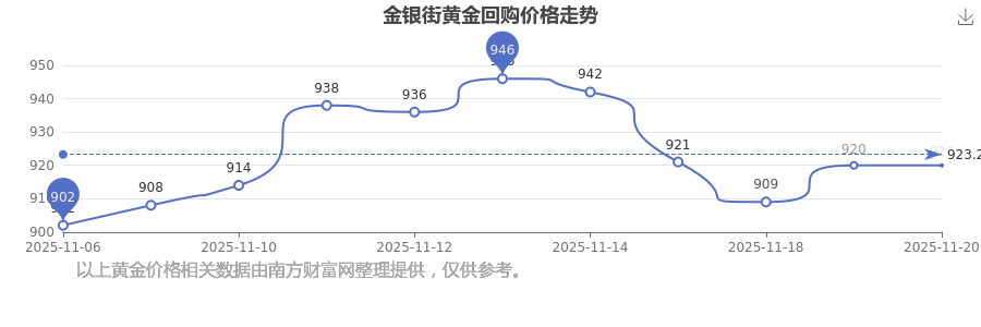 今日(2025年11月20日)金銀街黃金回購價(jià)格為920.0元/克。