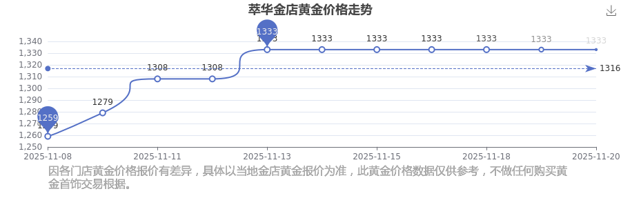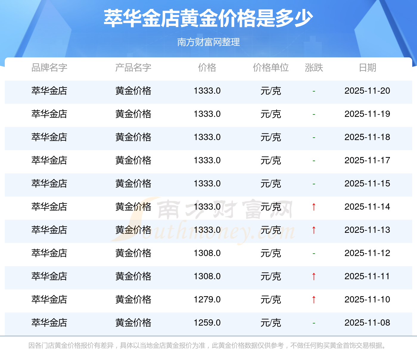今日(2025年11月20日)萃華金店黃金價格:1333.0元/克。