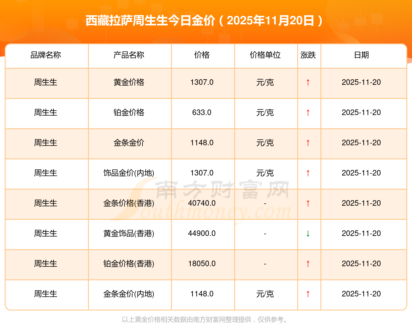 2025年11月20日西藏拉薩周生生金價(jià)查詢:鉑金價(jià)格540.0元/克,PT950鉑金540.0元/克,PT990鉑金545.0元/克,PT999鉑金552.0元/克,飾品金條價(jià)格1060.0元/克,擺件價(jià)格392.0元/克,足金價(jià)格1270.0元/克,基礎(chǔ)銀價(jià)11.8元/克,黃金價(jià)格1302.0元/克,鉑金價(jià)格600.0元/克,金條/金塊價(jià)格1257.0元/克。