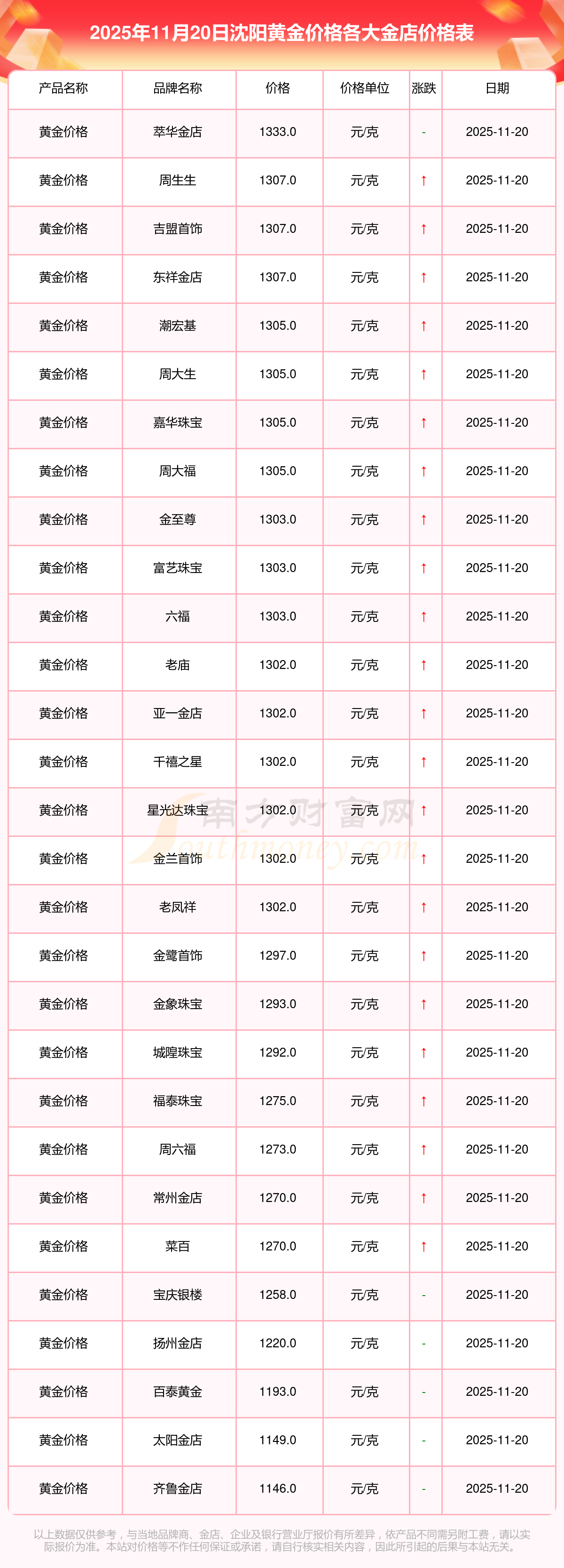 沈陽各大金店黃金價(jià)格表來了-2025年11月20日沈陽各大金店黃金價(jià)格多少錢一克?