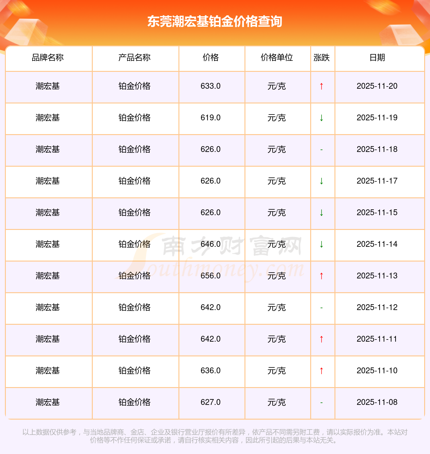 今日東莞潮宏基鉑金價格公布今天市面上,每克黃金的價格是多少2025年11月20日東莞潮宏基鉑金價格:633.0元/克。