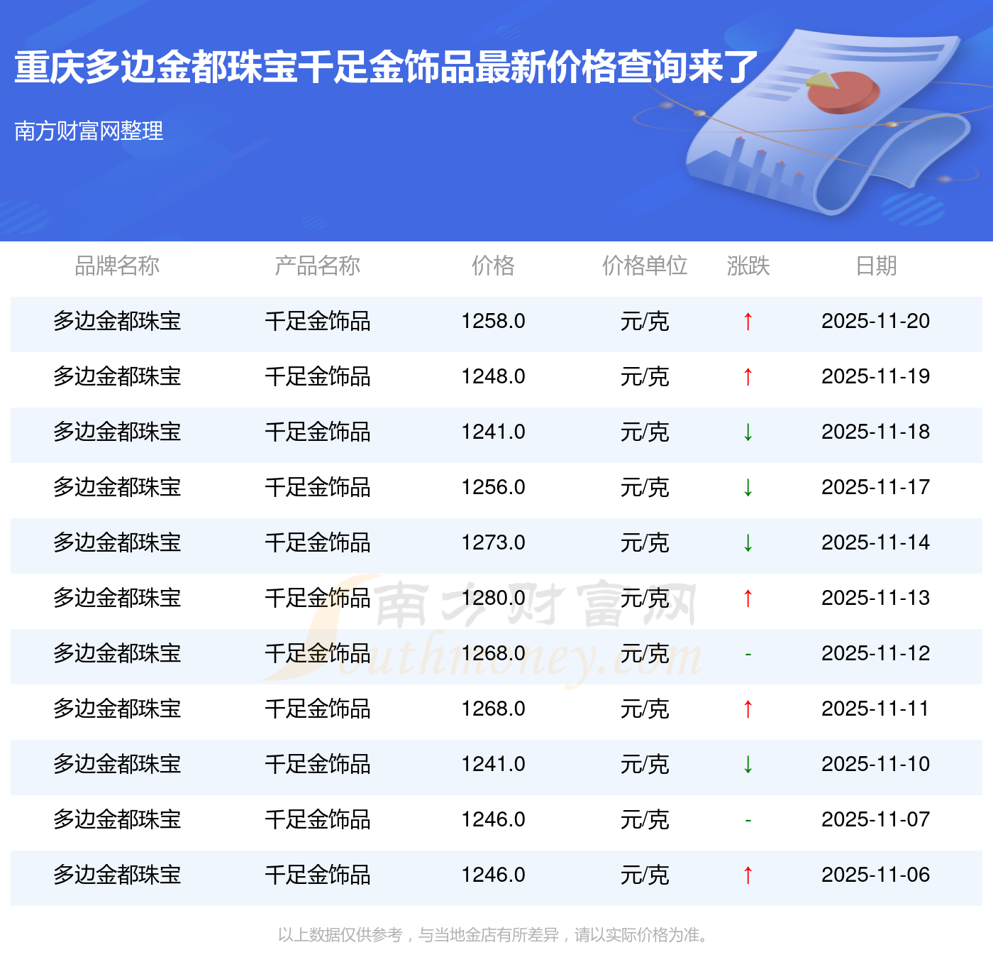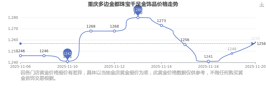 今日(2025年11月20日)重慶多邊金都珠寶千足金飾品價格:1258.0元/克。