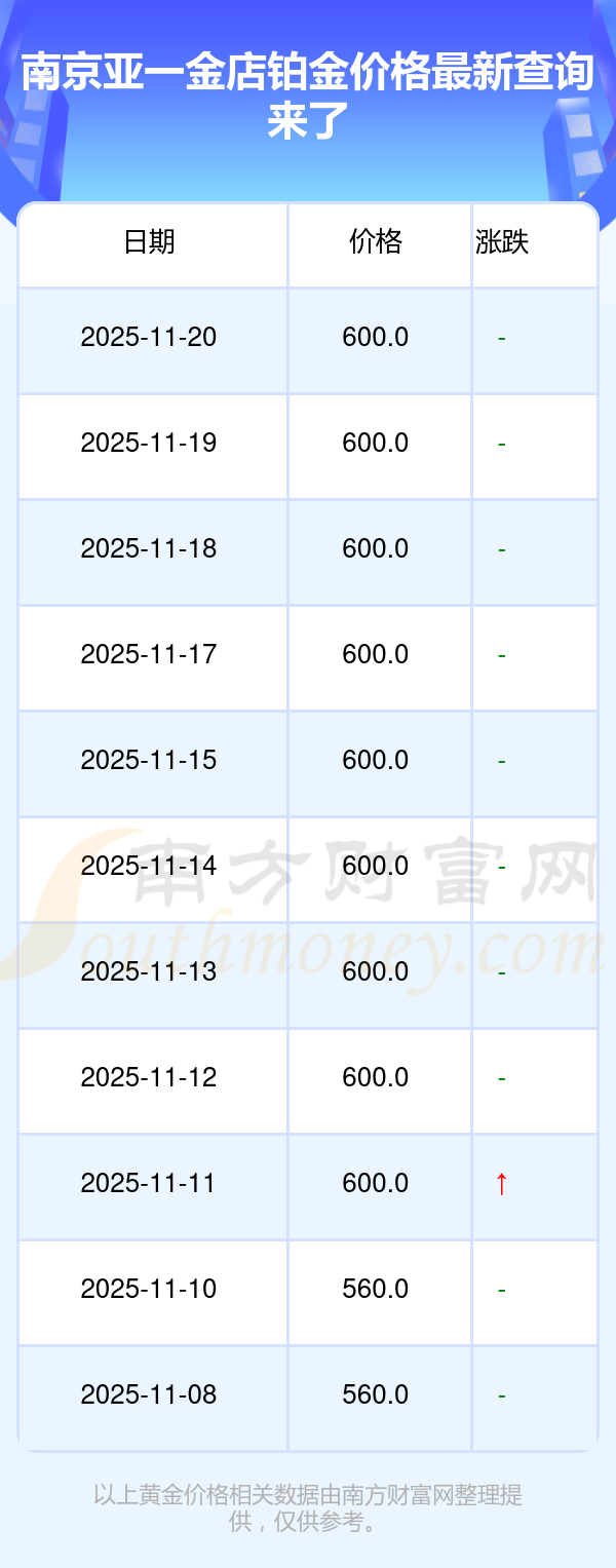 2025年11月20日菜百、菜百、菜百、菜百、菜百、菜百、菜百、菜百、老廟、老廟、老廟等各大金店品牌鉑金價格最新價格如下:菜百鉑金價格540.0元/克,菜百PT950鉑金540.0元/克,菜百PT990鉑金545.0元/克,菜百PT999鉑金552.0元/克,菜百飾品金條價格1060.0元/克,菜百擺件價格392.0元/克,菜百足金價格1270.0元/克,菜百基礎銀價11.8元/克,老廟黃金價格1302.0元/克,老廟鉑金價格600.0元/克,老廟金條/金塊價格1257.0元/克。