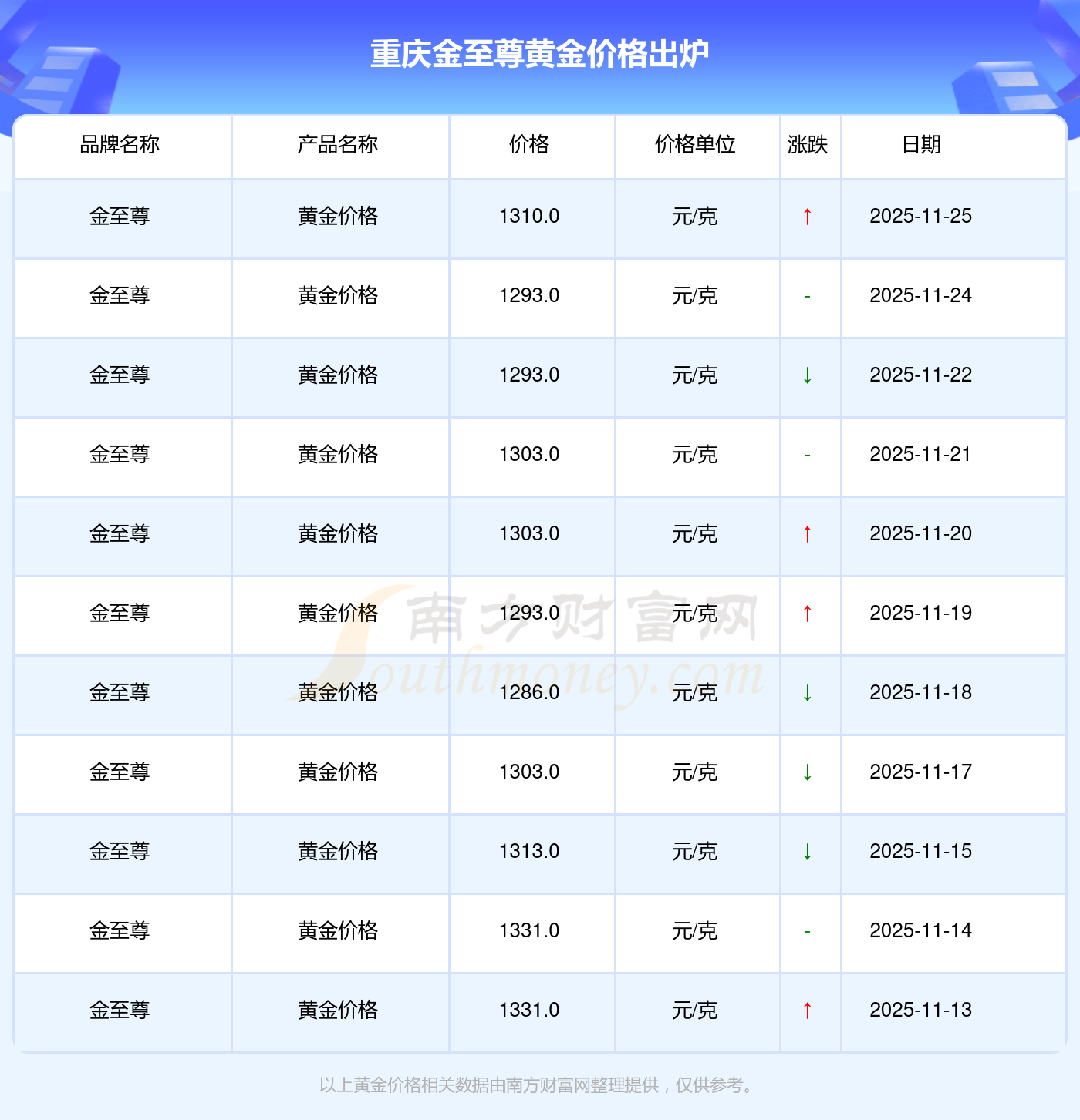 2025年11月25日重慶金至尊黃金價(jià)格:1310.0元/克。