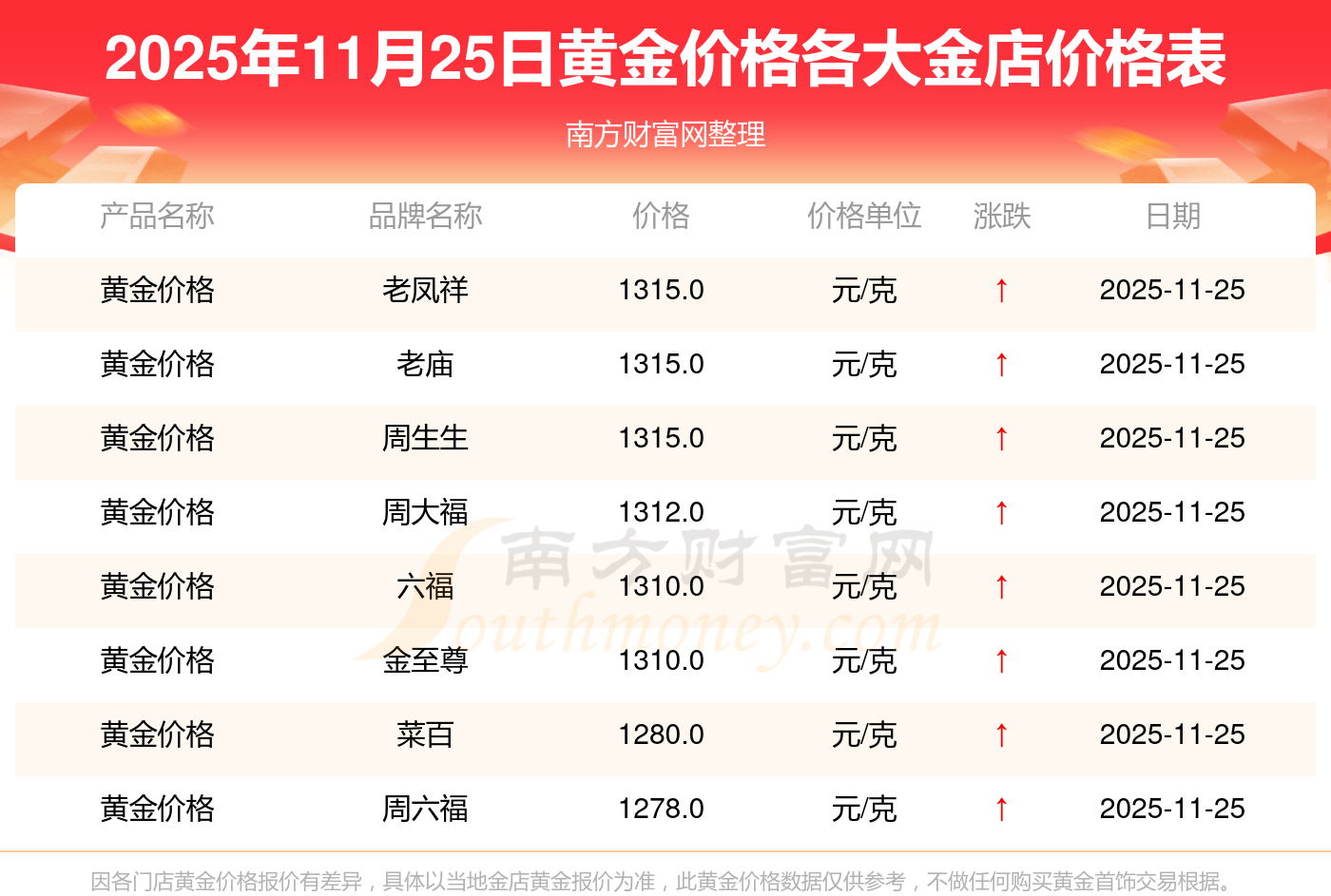 2025年11月25日各大金店黃金價(jià)格最新價(jià)格:周大福1312.0元/克,周大福627.0元/克,周大福1312.0元/克,周大福45780.0,周大福17900.0,周大福41290.0,周大福1148.0元/克,老鳳祥1315.0元/克,老鳳祥600.0元/克,老鳳祥1315.0元/克,周六福1278.0元/克。