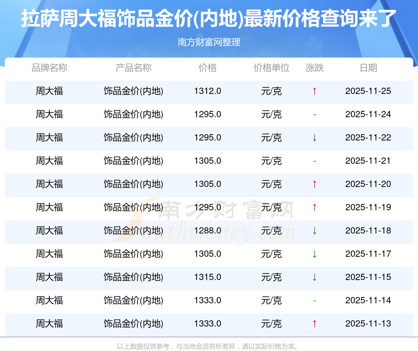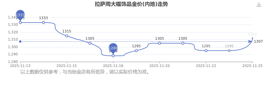 今日拉薩周大福飾品金價(內(nèi)地):1312.0元/克。