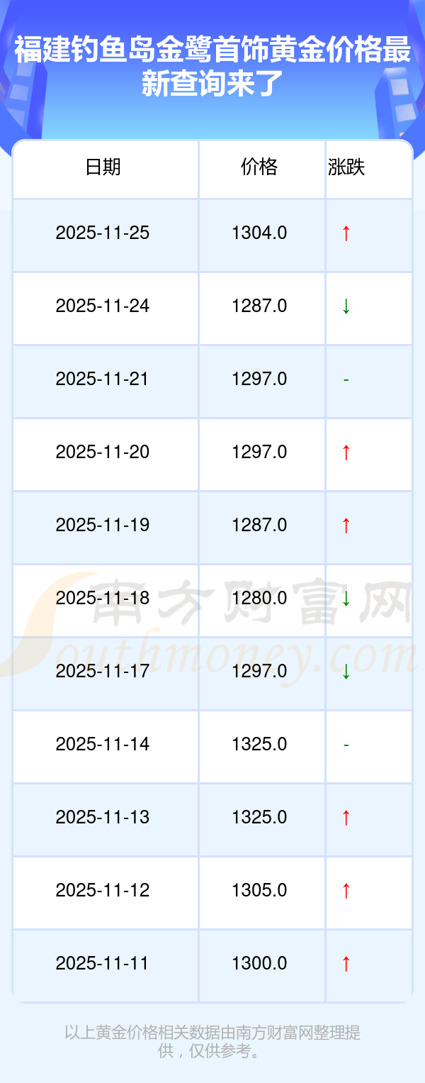 福建釣魚島金鷺首飾在 2025年11月25日的黃金價(jià)格零售價(jià)格為 1304.0元/克。