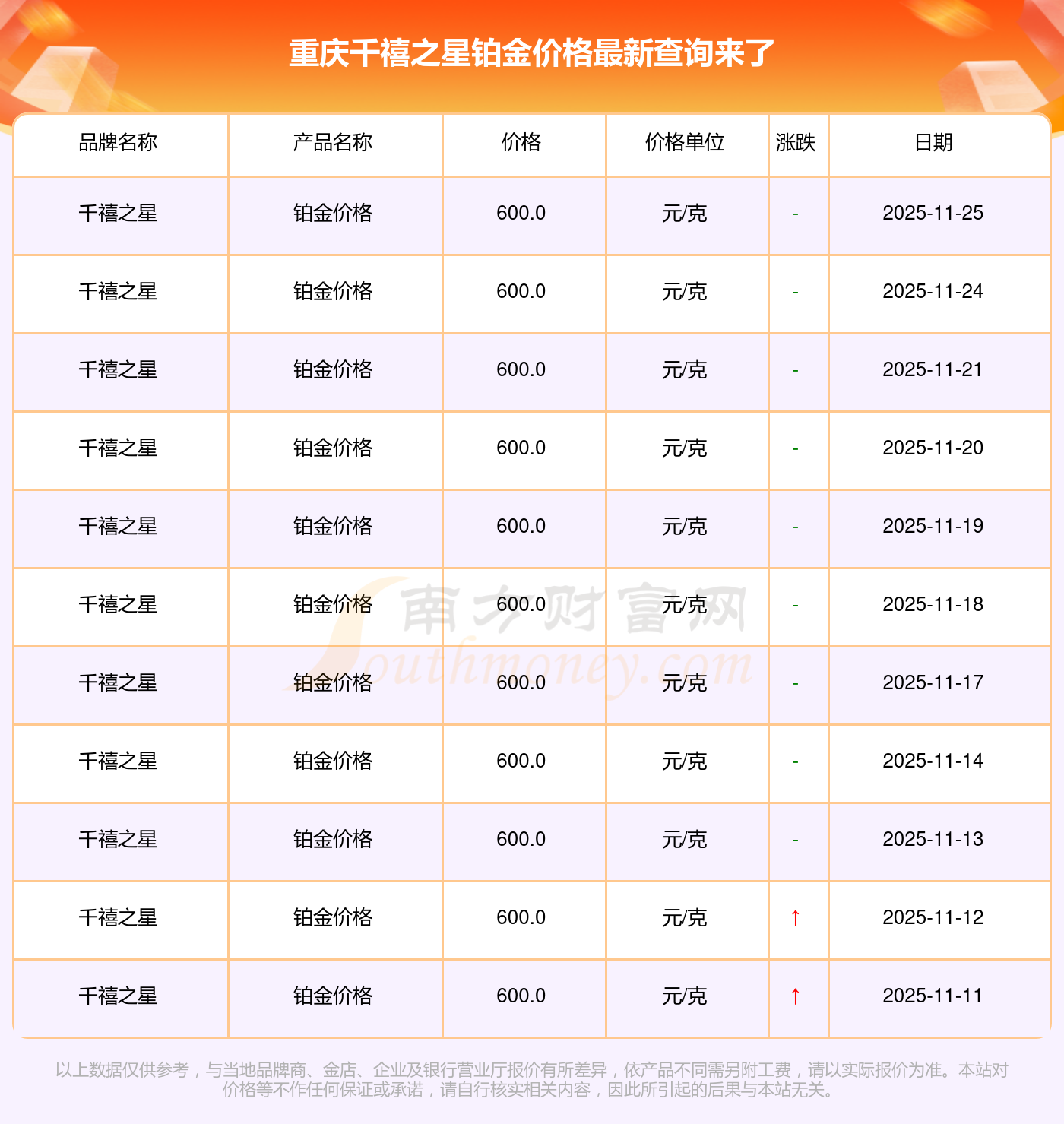 今日(2025年11月25日),重慶千禧之星鉑金價(jià)格每克的價(jià)值為600.0元/克。