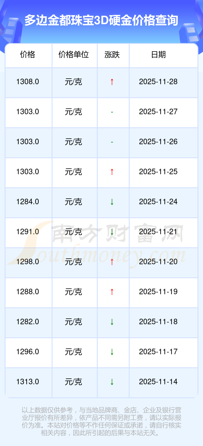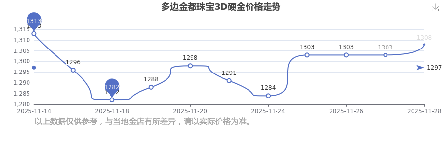 今日多邊金都珠寶 3D硬金價(jià)格,最新確定為1308.0元/克。