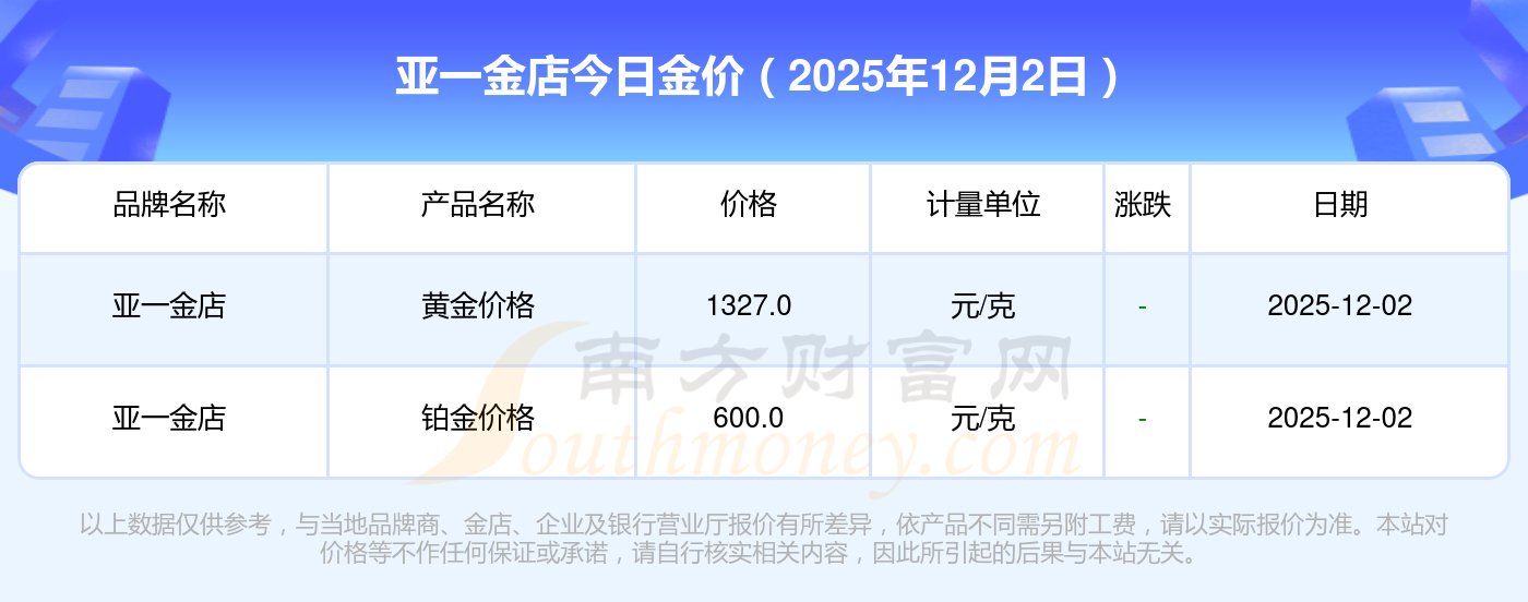 2025年12月2日各大金店鉑金價(jià)格最新價(jià)格:東祥金店1328.0元/克,東祥金店669.0元/克,萃華金店1295.0元/克,萃華金店364.0元/克,百泰黃金1245.0元/克,百泰黃金1110.0元/克,金象珠寶1316.0元/克,常州金店1290.0元/克,常州金店598.0元/克,揚(yáng)州金店1220.0元/克,揚(yáng)州金店500.0元/克。
