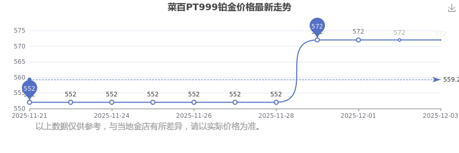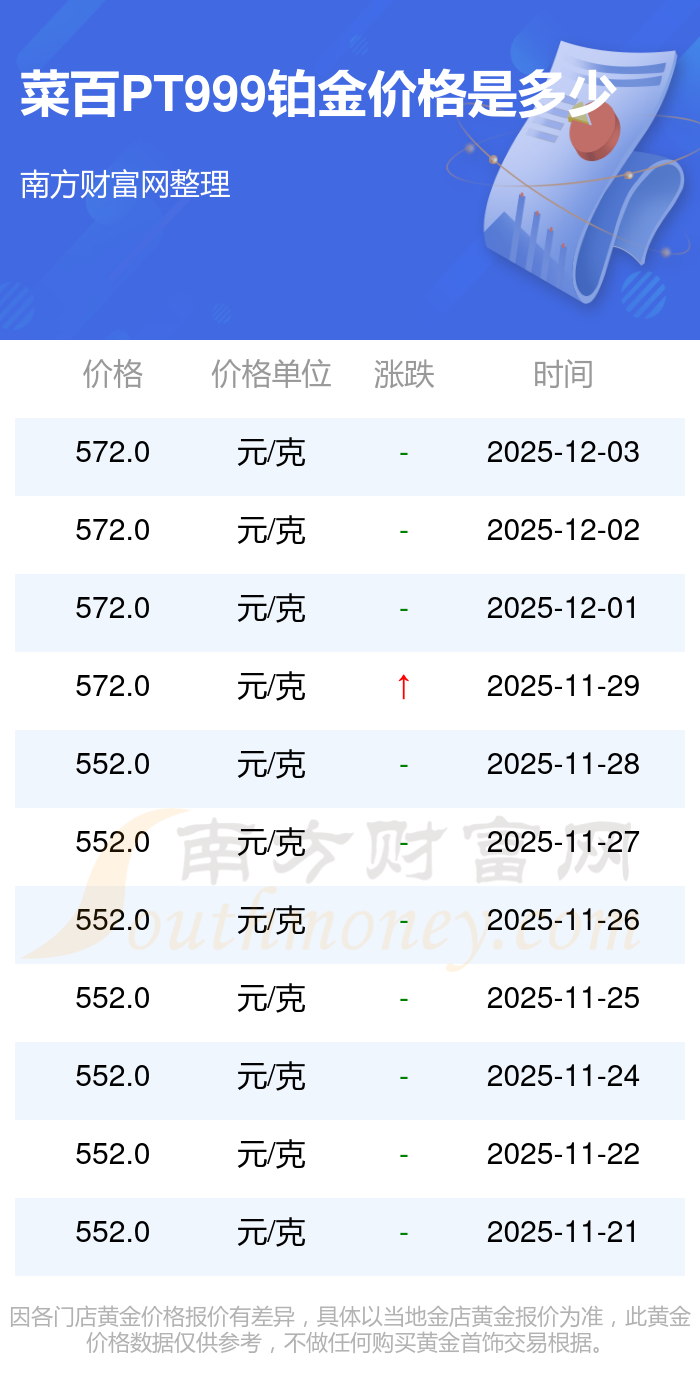 菜百 PT999鉑金今日最新的價(jià)位是572.0元/克。