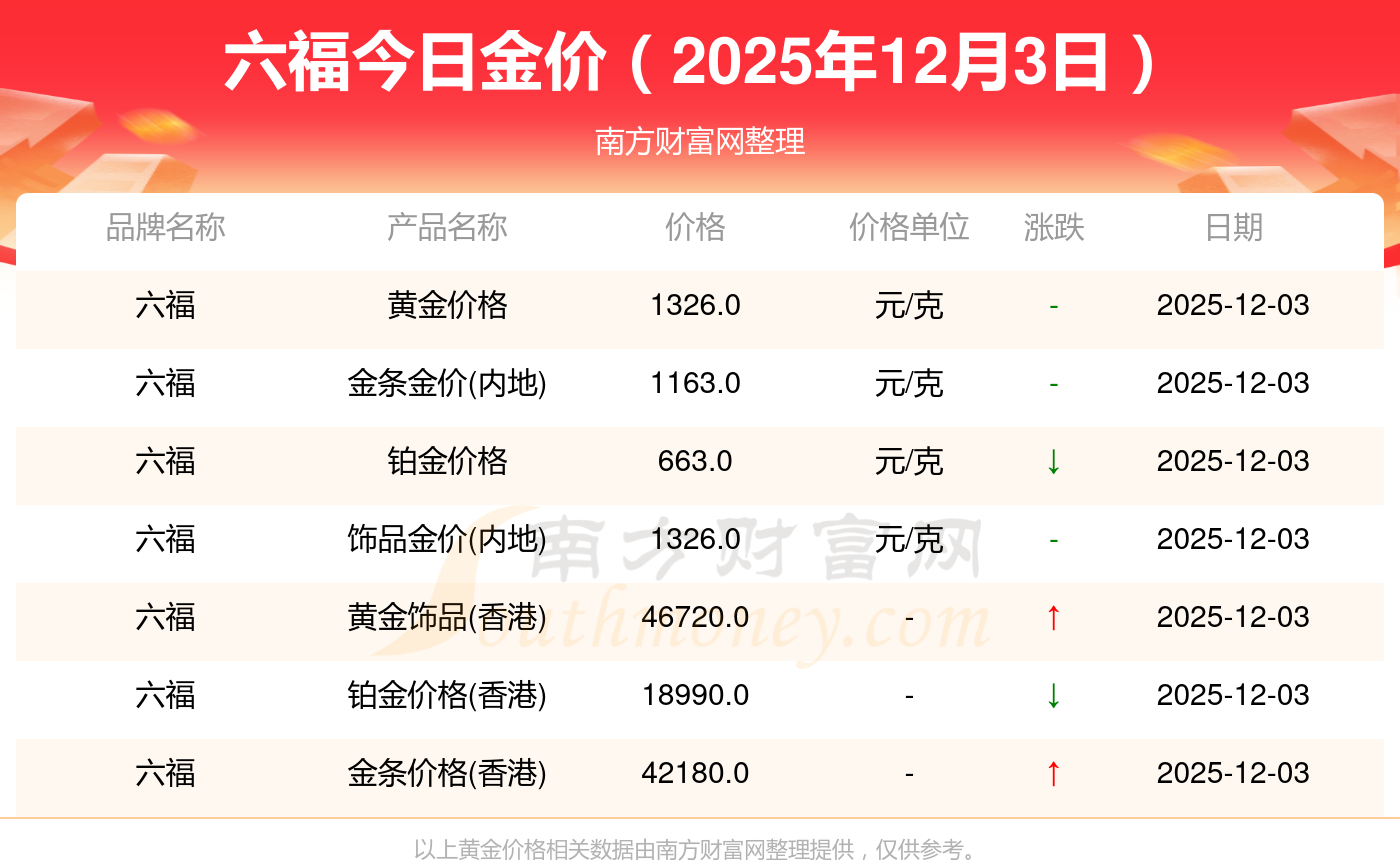 2025年12月3日,周大福、周大福、周大福、周大福、周大福、周大福、周大福、老鳳祥、老鳳祥、老鳳祥、六福等各大金店品牌鉑金價(jià)格今日價(jià)格如下:周大福1328.0元/克、周大福663.0元/克、周大福1328.0元/克、周大福46770.0、周大福18990.0、周大福42190.0、周大福1165.0元/克、老鳳祥1327.0元/克、老鳳祥600.0元/克、老鳳祥1327.0元/克、六福1326.0元/克。