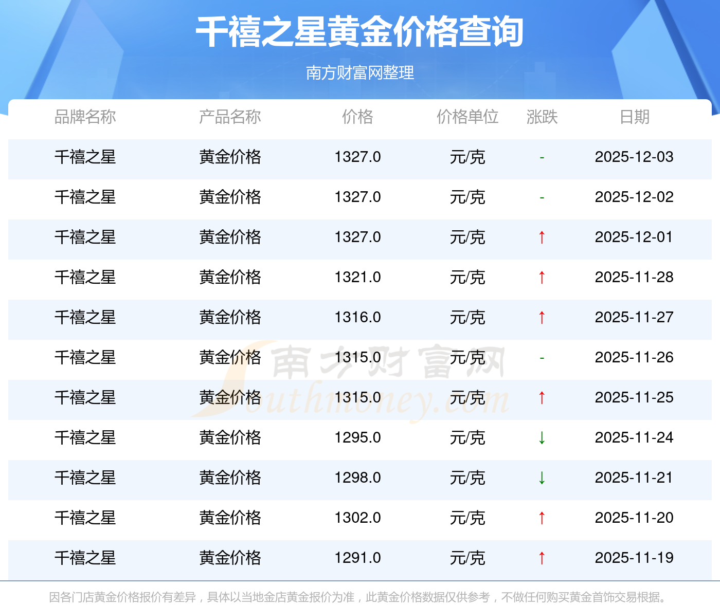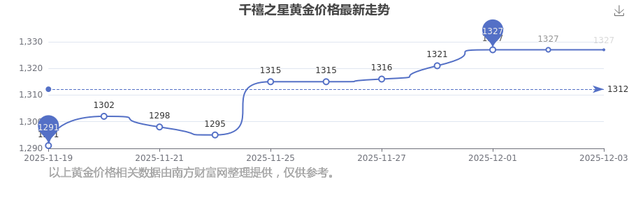 今天黃金價格是多少?現(xiàn)在黃金一克的價錢是怎樣的?一般情況下1克黃金的價格會在多少呢?2025年12月3日千禧之星黃金價格:1327.0元/克。