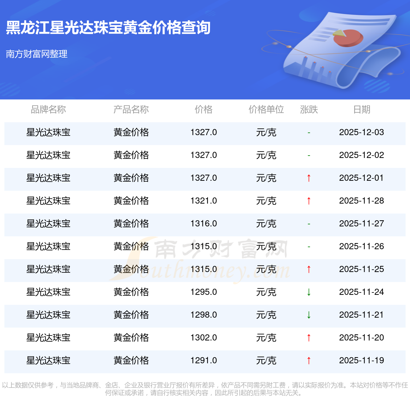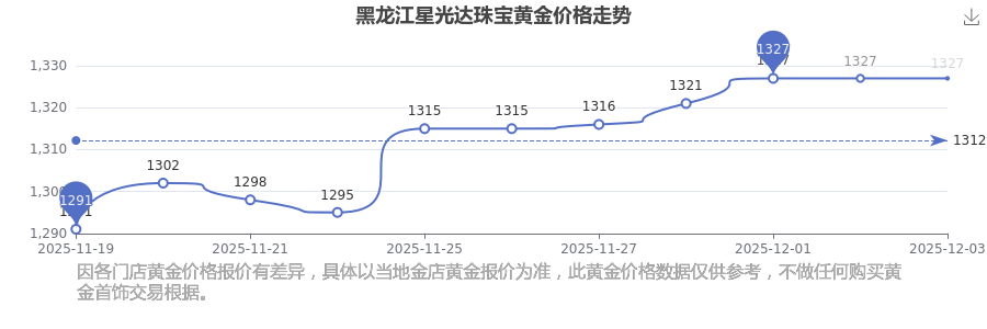 2025年12月3日,黑龍江星光達(dá)珠寶所售黃金價(jià)格,其價(jià)格設(shè)定為 1327.0元/克。