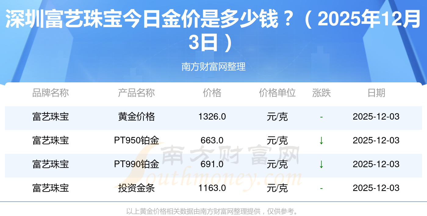 2025年12月3日深圳富藝珠寶黃金價(jià)格最新查詢(xún),看看現(xiàn)在金價(jià)黃金多少錢(qián)一克,隨小編來(lái)了解一下詳情。