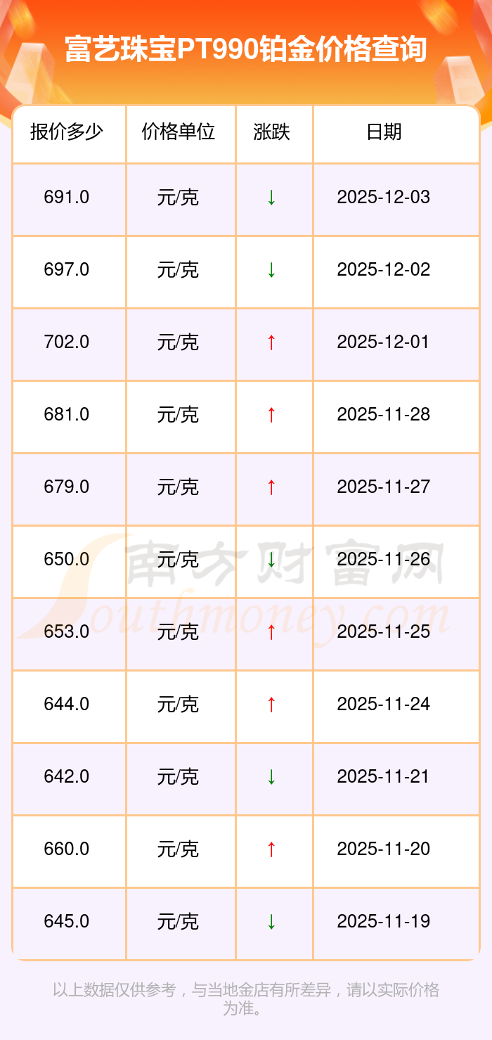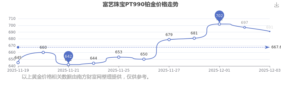 目前富藝珠寶 PT990鉑金的價格,今日最新為691.0元/克。