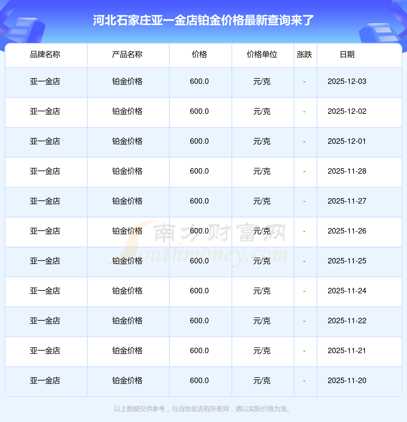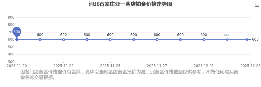 河北石家莊亞一金店鉑金價格在 2025年12月3日,其市場價格為 600.0元/克。