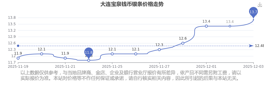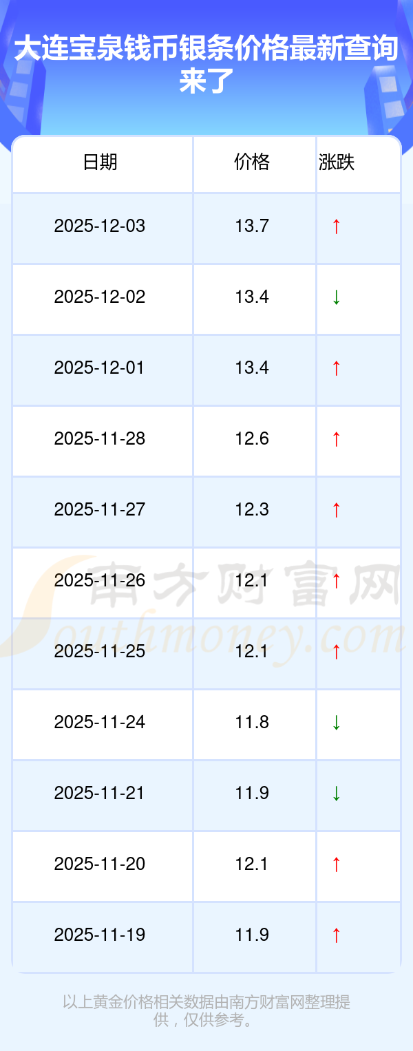 今日(2025年12月3日),大連寶泉錢幣銀條價格每克的價值為13.7元/克。
