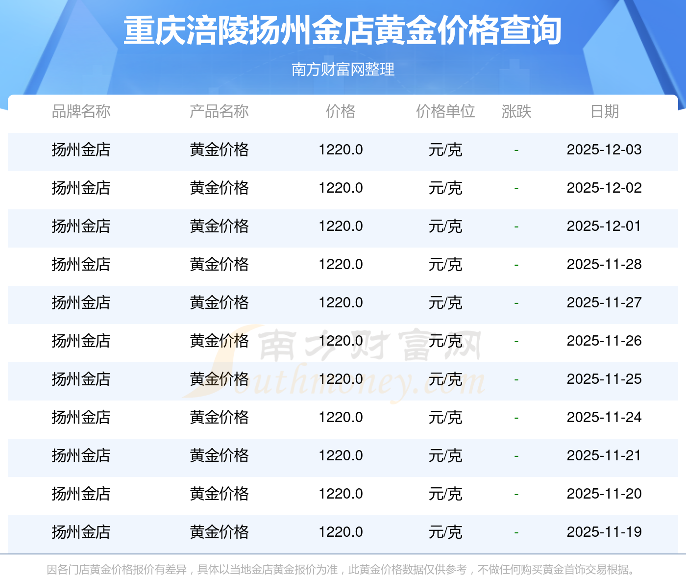 今日重慶涪陵揚(yáng)州金店黃金價(jià)格是1220.0元/克。