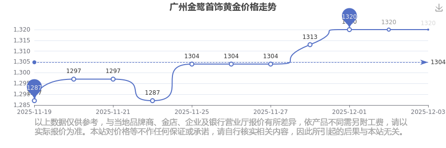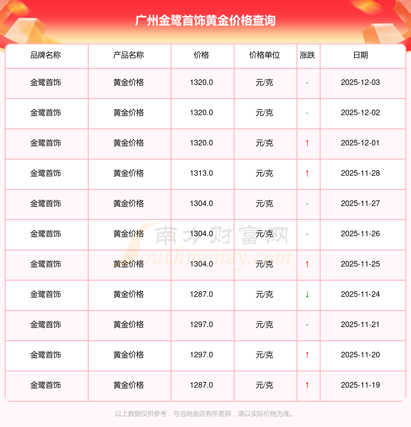 今日(2025年12月3日)廣州金鷺首飾黃金價(jià)格為1320.0元/克。