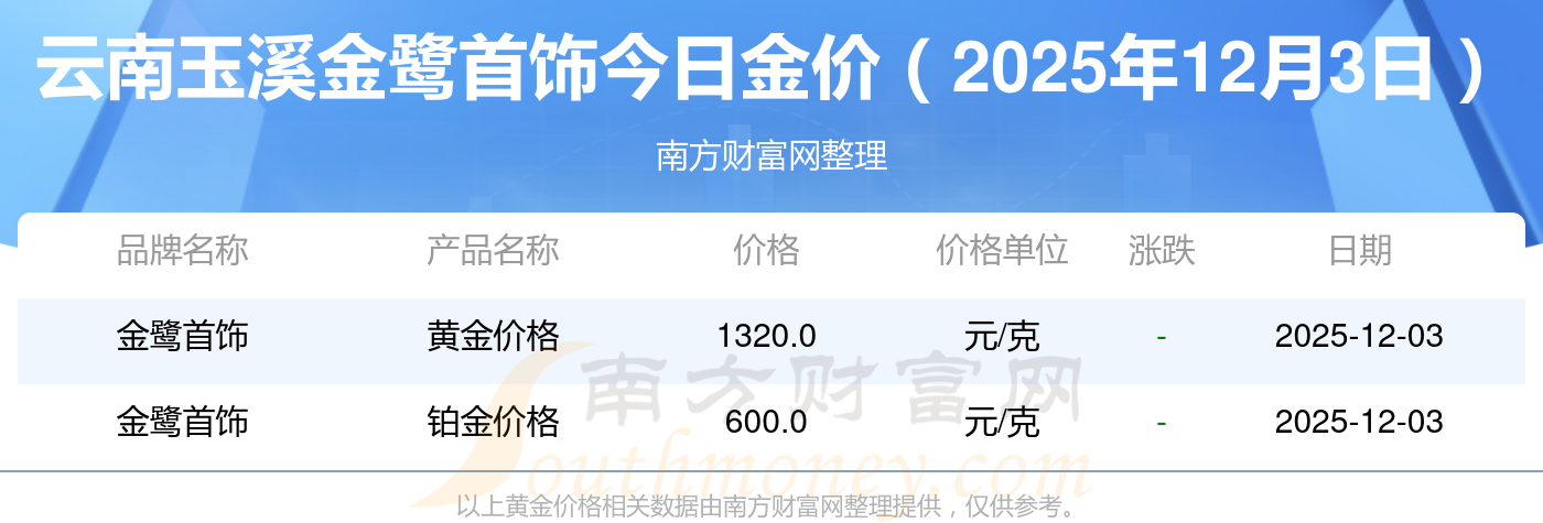 今天黃金價(jià)格幾何?現(xiàn)在每克黃金值多少錢?2025年12月3日云南玉溪金鷺首飾一克黃金對應(yīng)的價(jià)格是多少?黃金價(jià)格1328.0元/克,鉑金價(jià)格663.0元/克,飾品金價(jià)(內(nèi)地)1328.0元/克,黃金飾品(香港)46770.0,鉑金價(jià)格(香港)18990.0,金條價(jià)格(香港)42190.0,金條金價(jià)(內(nèi)地)1165.0元/克,黃金價(jià)格1327.0元/克,鉑金價(jià)格600.0元/克,足金價(jià)格1327.0元/克,黃金價(jià)格1326.0元/克。