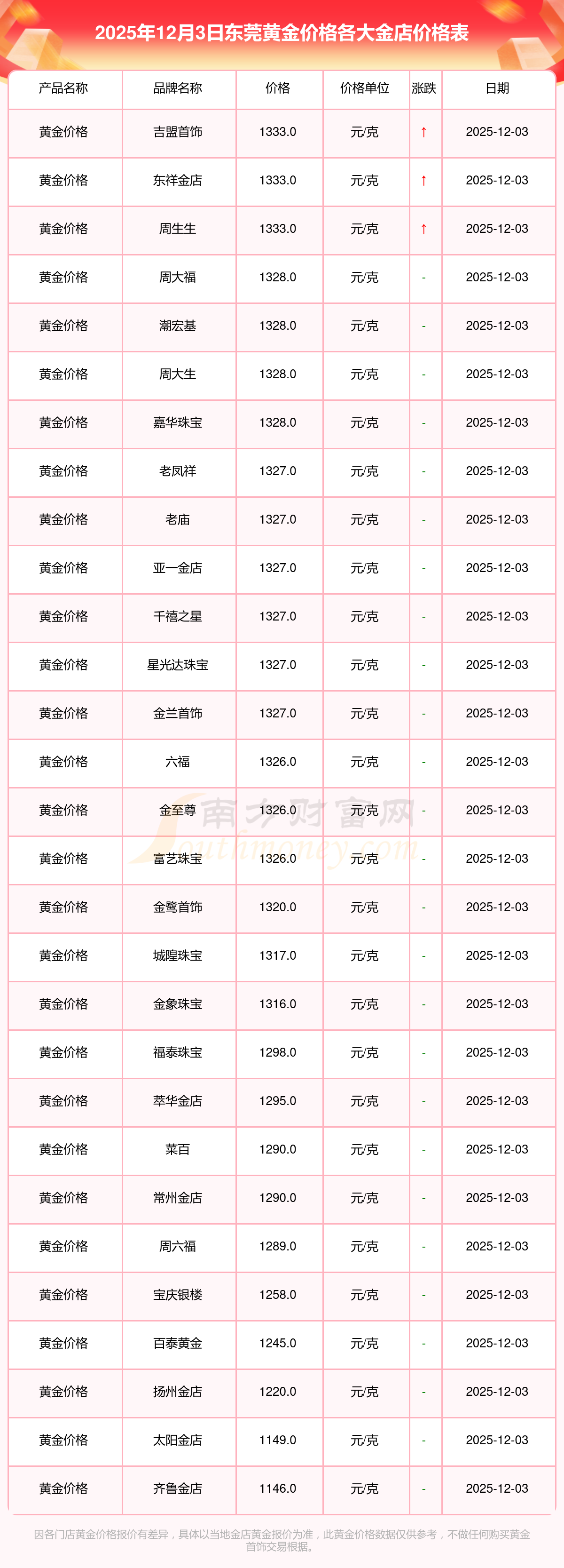 2025年12月3日東莞各大金店黃金價(jià)格最新價(jià)格:周大福1328.0元/克,周大福663.0元/克,周大福1328.0元/克,周大福46770.0,周大福18990.0,周大福42190.0,周大福1165.0元/克,老鳳祥1327.0元/克,老鳳祥600.0元/克,老鳳祥1327.0元/克,六福1326.0元/克。