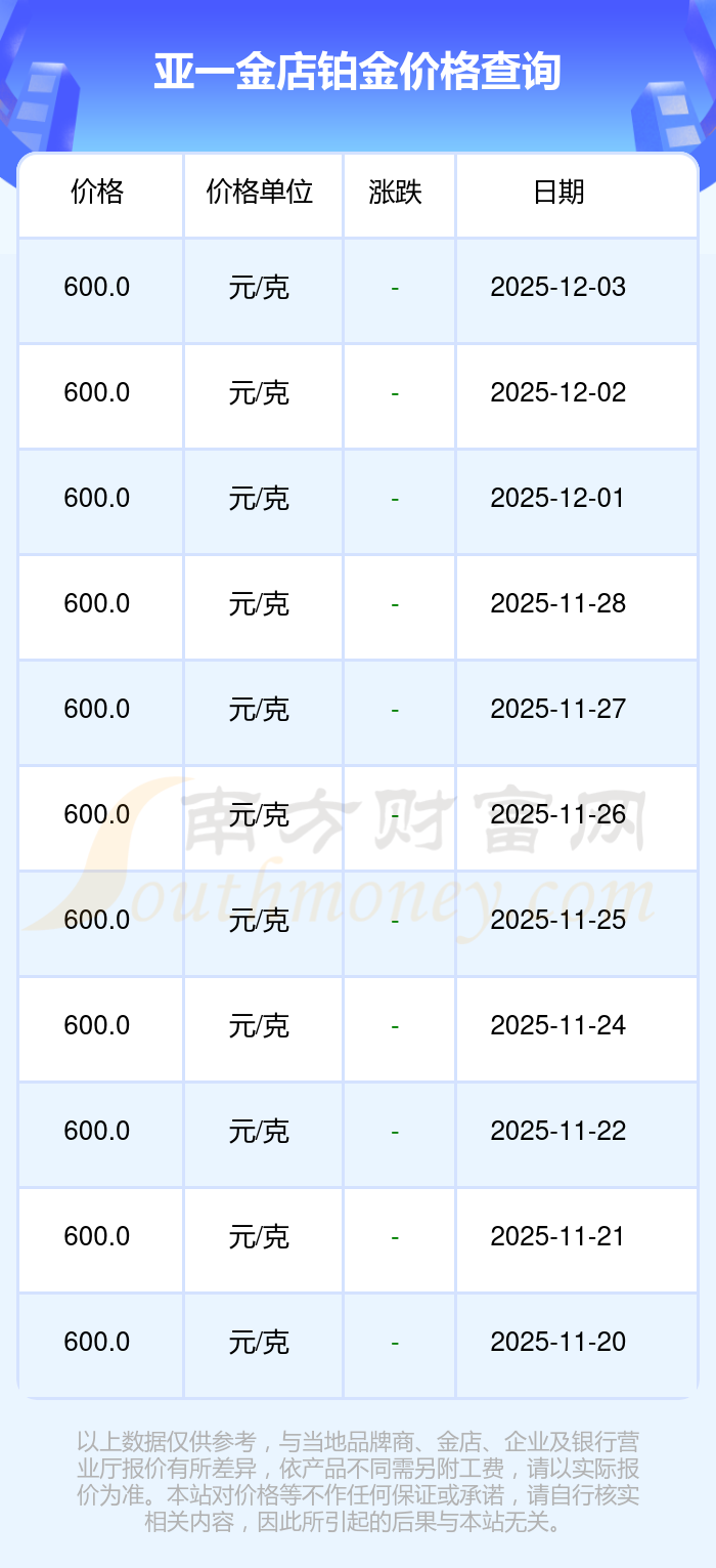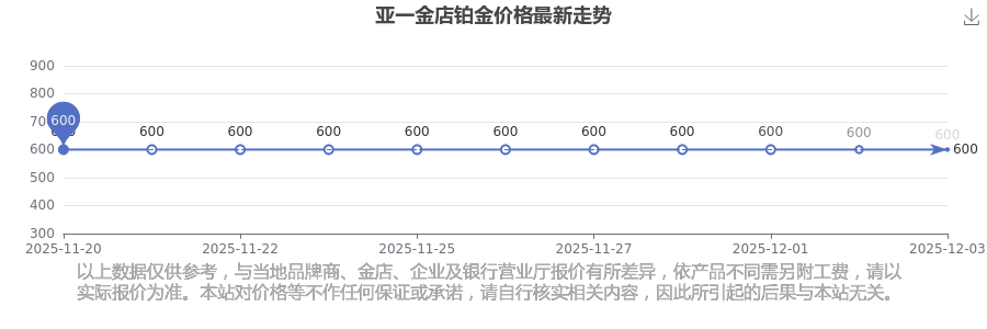 今日亞一金店鉑金價(jià)格最新查詢(xún):600.0元/克。