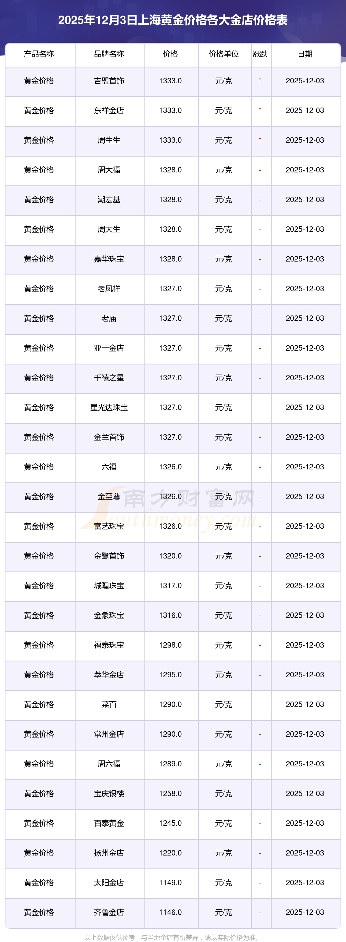 2025年12月3日,上海周大福、周大福、周大福、周大福、周大福、周大福、周大福、老鳳祥、老鳳祥、老鳳祥、六福等各大金店品牌黃金價(jià)格今日價(jià)格如下:周大福1328.0元/克、周大福663.0元/克、周大福1328.0元/克、周大福46770.0、周大福18990.0、周大福42190.0、周大福1165.0元/克、老鳳祥1327.0元/克、老鳳祥600.0元/克、老鳳祥1327.0元/克、六福1326.0元/克。