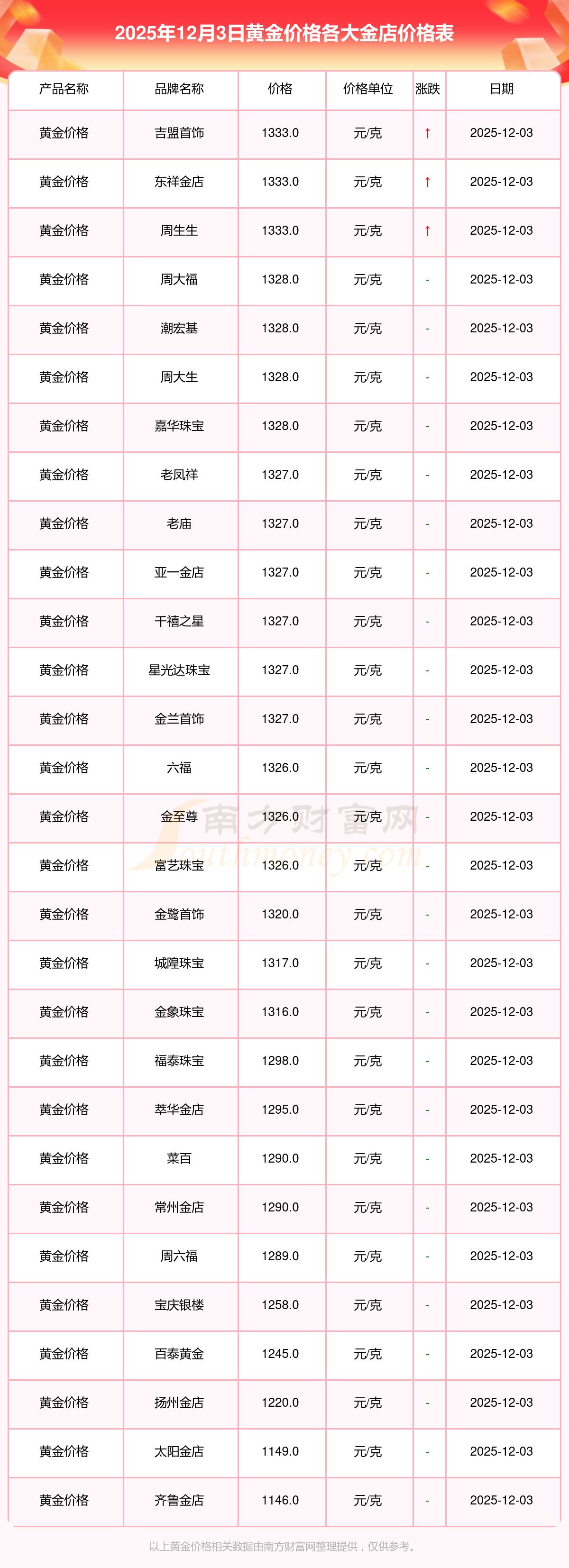 2025年12月3日周大福、周大福、周大福、周大福、周大福、周大福、周大福、老鳳祥、老鳳祥、老鳳祥、六福等各大金店品牌黃金價格最新價格如下:周大福黃金價格1328.0元/克,周大福鉑金價格663.0元/克,周大福飾品金價(內地)1328.0元/克,周大福黃金飾品(香港)46770.0,周大福鉑金價格(香港)18990.0,周大福金條價格(香港)42190.0,周大福金條金價(內地)1165.0元/克,老鳳祥黃金價格1327.0元/克,老鳳祥鉑金價格600.0元/克,老鳳祥足金價格1327.0元/克,六福黃金價格1326.0元/克。