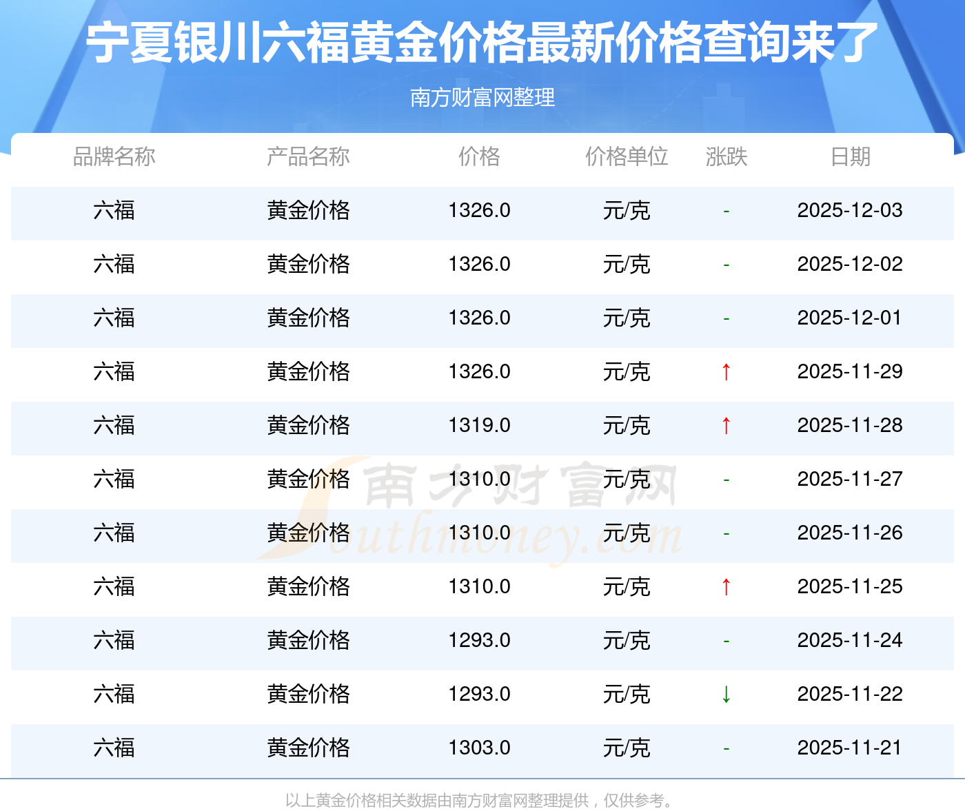 今日(2025年12月3日)寧夏銀川六福黃金價格是1326.0元/克。