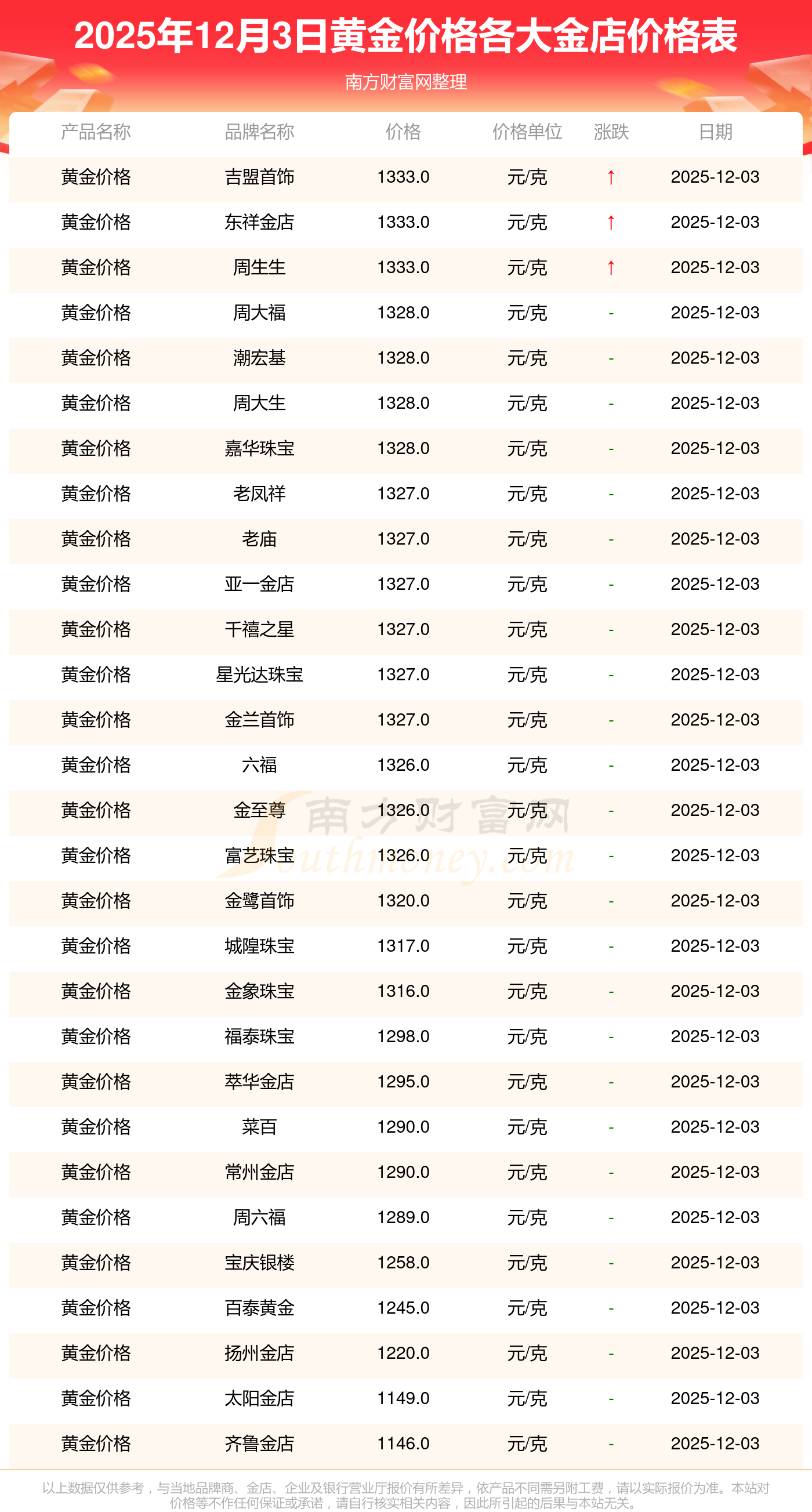 2025年12月3日,周大福、周大福、周大福、周大福、周大福、周大福、周大福、老鳳祥、老鳳祥、老鳳祥、六福等各大金店品牌黃金價格今日價格如下:周大福1328.0元/克、周大福663.0元/克、周大福1328.0元/克、周大福46770.0、周大福18990.0、周大福42190.0、周大福1165.0元/克、老鳳祥1327.0元/克、老鳳祥600.0元/克、老鳳祥1327.0元/克、六福1326.0元/克。