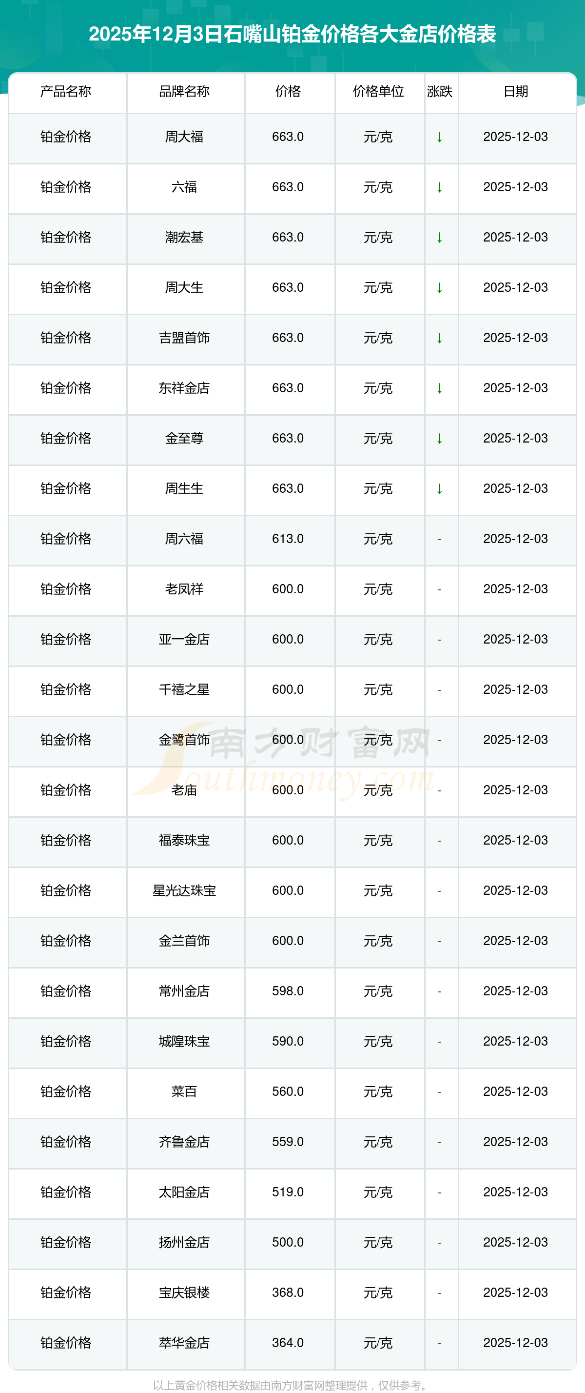 今天是2025年12月3日,石嘴山周大福、周大福、周大福、周大福、周大福、周大福、周大福、老鳳祥、老鳳祥、老鳳祥、六福等各大金店品牌鉑金價(jià)格最新價(jià)格如下:周大福1328.0元/克、周大福663.0元/克、周大福1328.0元/克、周大福46770.0、周大福18990.0、周大福42190.0、周大福1165.0元/克、老鳳祥1327.0元/克、老鳳祥600.0元/克、老鳳祥1327.0元/克、六福1326.0元/克。