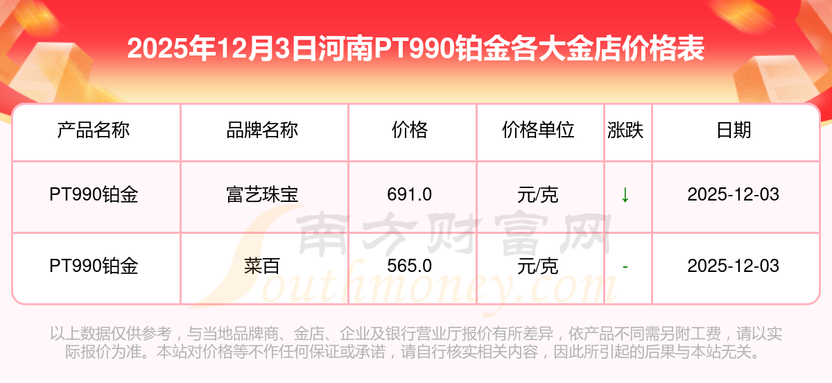 今天是2025年12月3日,河南周大福、周大福、周大福、周大福、周大福、周大福、周大福、老鳳祥、老鳳祥、老鳳祥、六福等各大金店品牌PT990鉑金最新價(jià)格行情是這樣的:周大福1328.0元/克、周大福663.0元/克、周大福1328.0元/克、周大福46770.0、周大福18990.0、周大福42190.0、周大福1165.0元/克、老鳳祥1327.0元/克、老鳳祥600.0元/克、老鳳祥1327.0元/克、六福1326.0元/克。