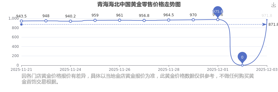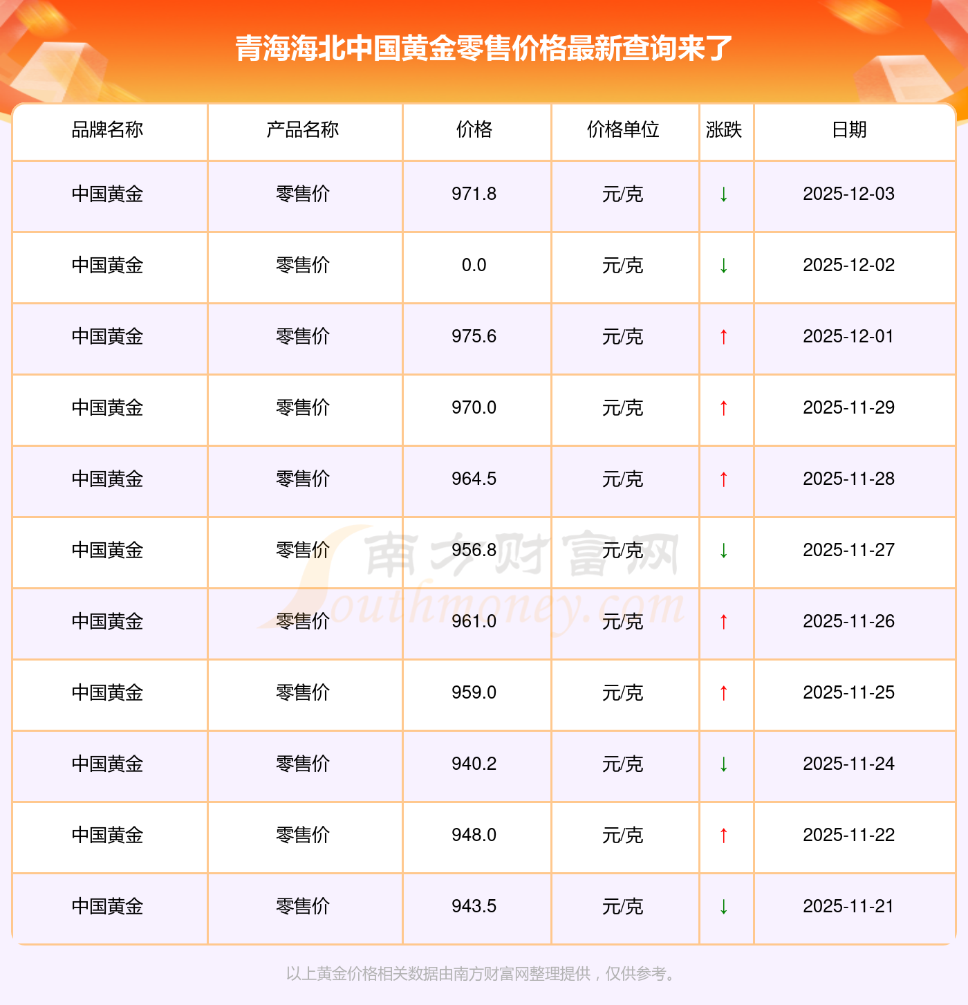 2025年12月3日,今日青海海北中國黃金零售價格:971.8元/克。