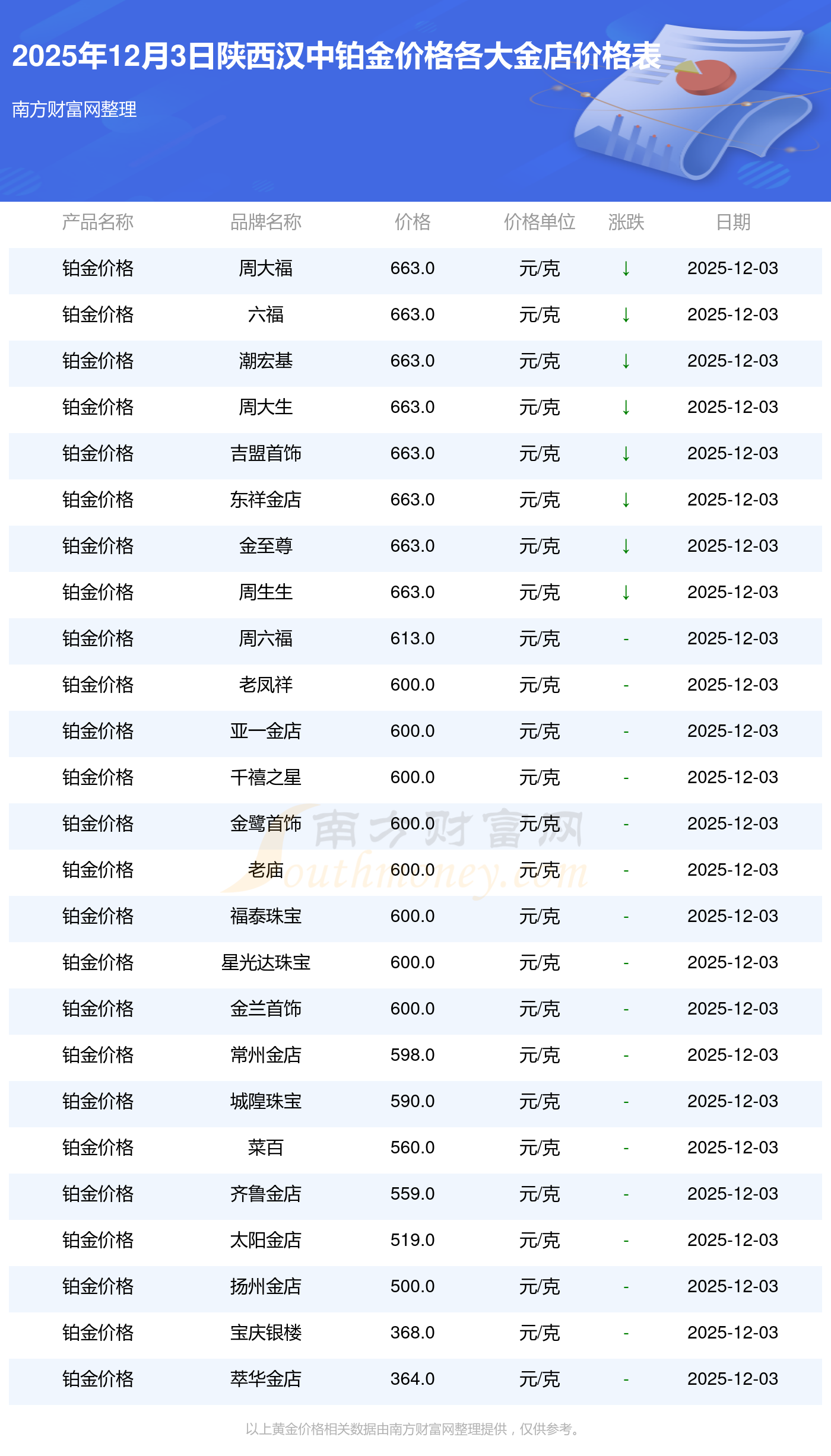 2025年12月3日陜西漢中各大金店鉑金價格最新價格查詢來了:周大福1328.0元/克,周大福663.0元/克,周大福1328.0元/克,周大福46770.0,周大福18990.0,周大福42190.0,周大福1165.0元/克,老鳳祥1327.0元/克,老鳳祥600.0元/克,老鳳祥1327.0元/克,六福1326.0元/克。