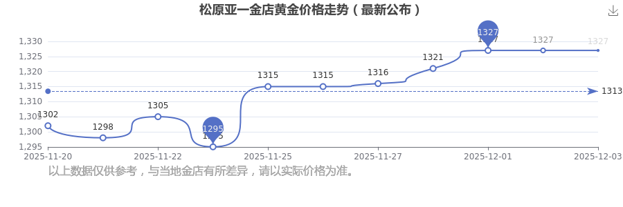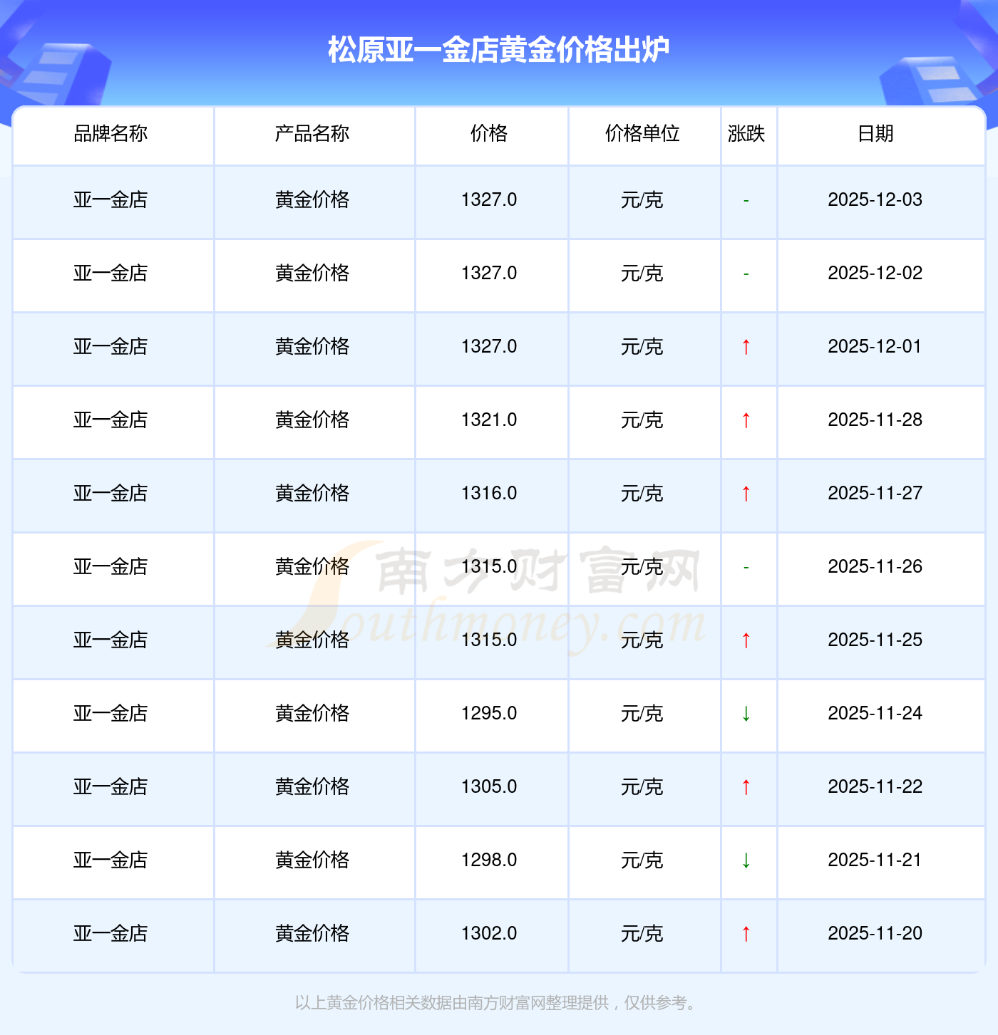 今日(2025年12月3日),1327.0元/克是松原亞一金店黃金價(jià)格的價(jià)格標(biāo)準(zhǔn)。