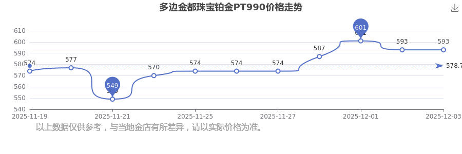 今日多邊金都珠寶鉑金PT990價格為593.0元/克。