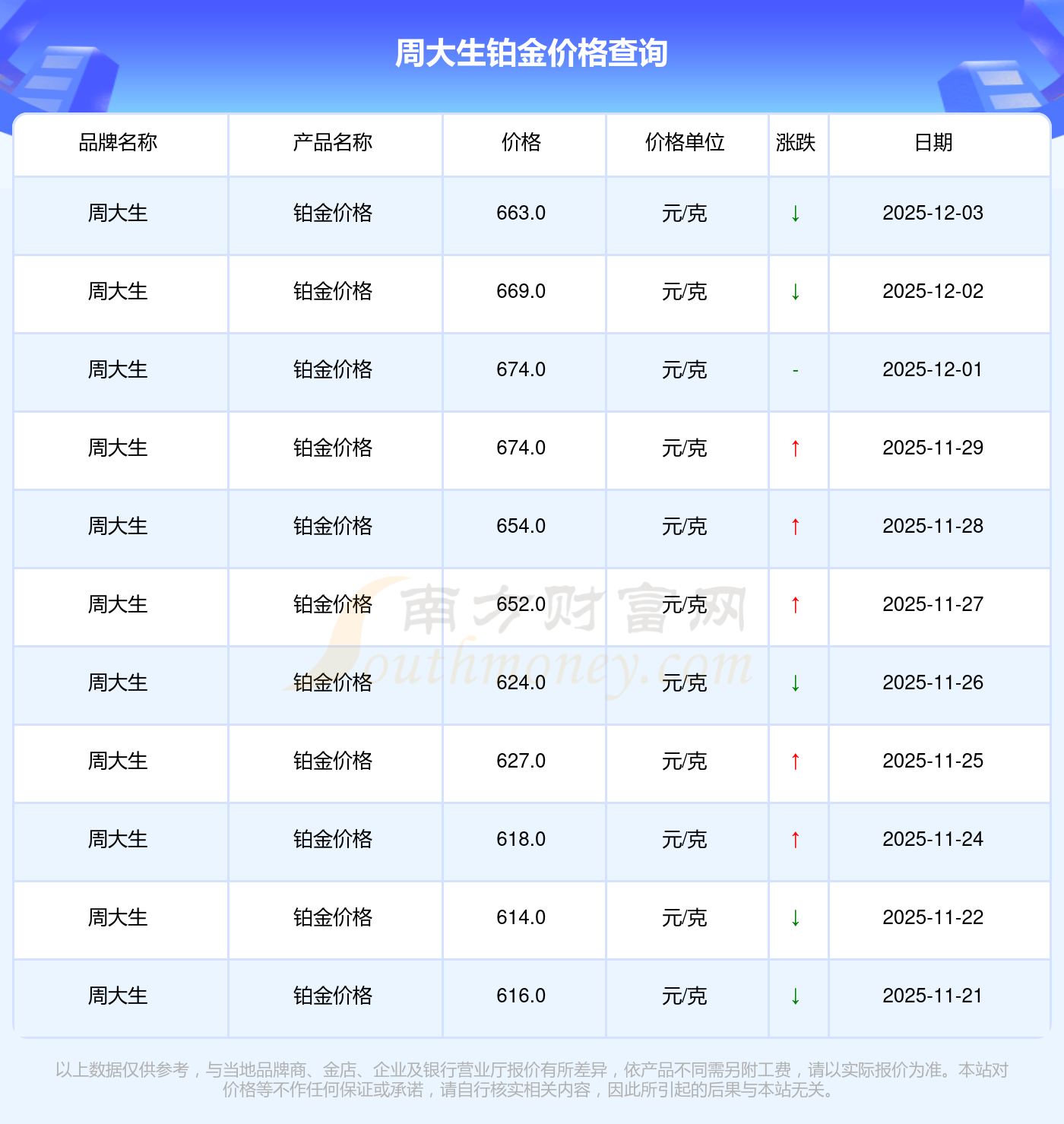 最新數(shù)據(jù)表明,周大生今日 鉑金價(jià)格為663.0元/克。