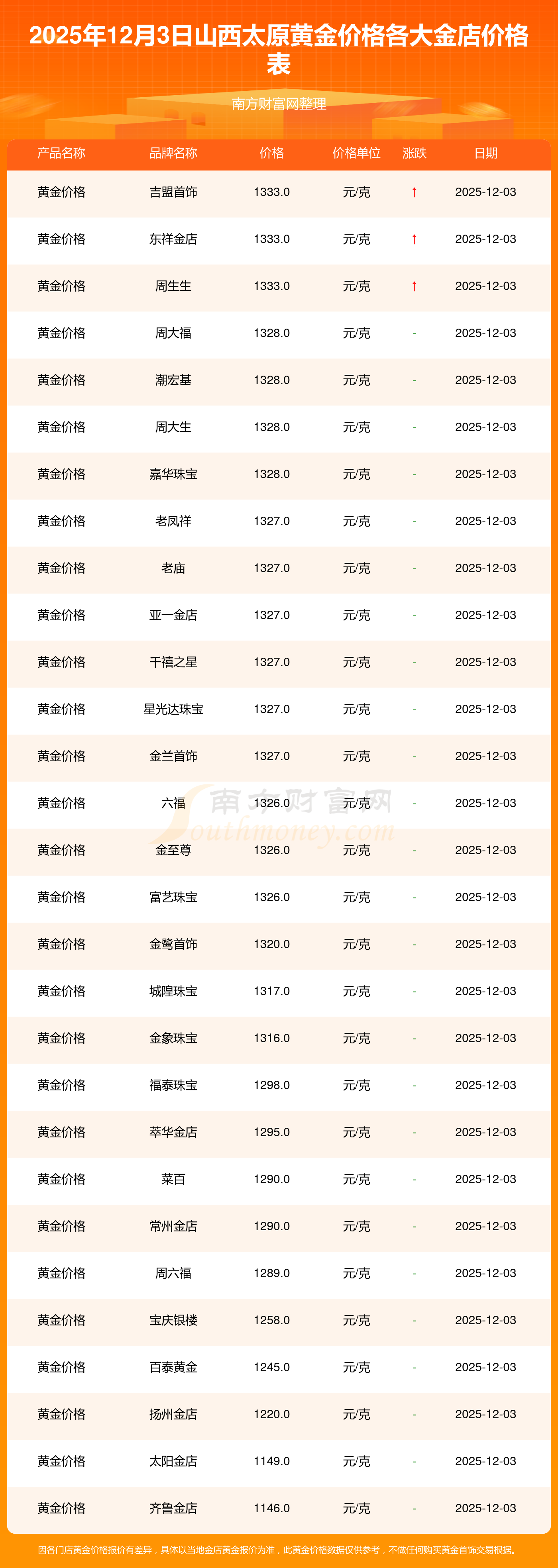 2025年12月3日山西太原周大福、周大福、周大福、周大福、周大福、周大福、周大福、老鳳祥、老鳳祥、老鳳祥、六福等各大金店品牌黃金價(jià)格最新價(jià)格行情來了,如下:周大福黃金價(jià)格1328.0元/克,周大福鉑金價(jià)格663.0元/克,周大福飾品金價(jià)(內(nèi)地)1328.0元/克,周大福黃金飾品(香港)46770.0,周大福鉑金價(jià)格(香港)18990.0,周大福金條價(jià)格(香港)42190.0,周大福金條金價(jià)(內(nèi)地)1165.0元/克,老鳳祥黃金價(jià)格1327.0元/克,老鳳祥鉑金價(jià)格600.0元/克,老鳳祥足金價(jià)格1327.0元/克,六福黃金價(jià)格1326.0元/克。