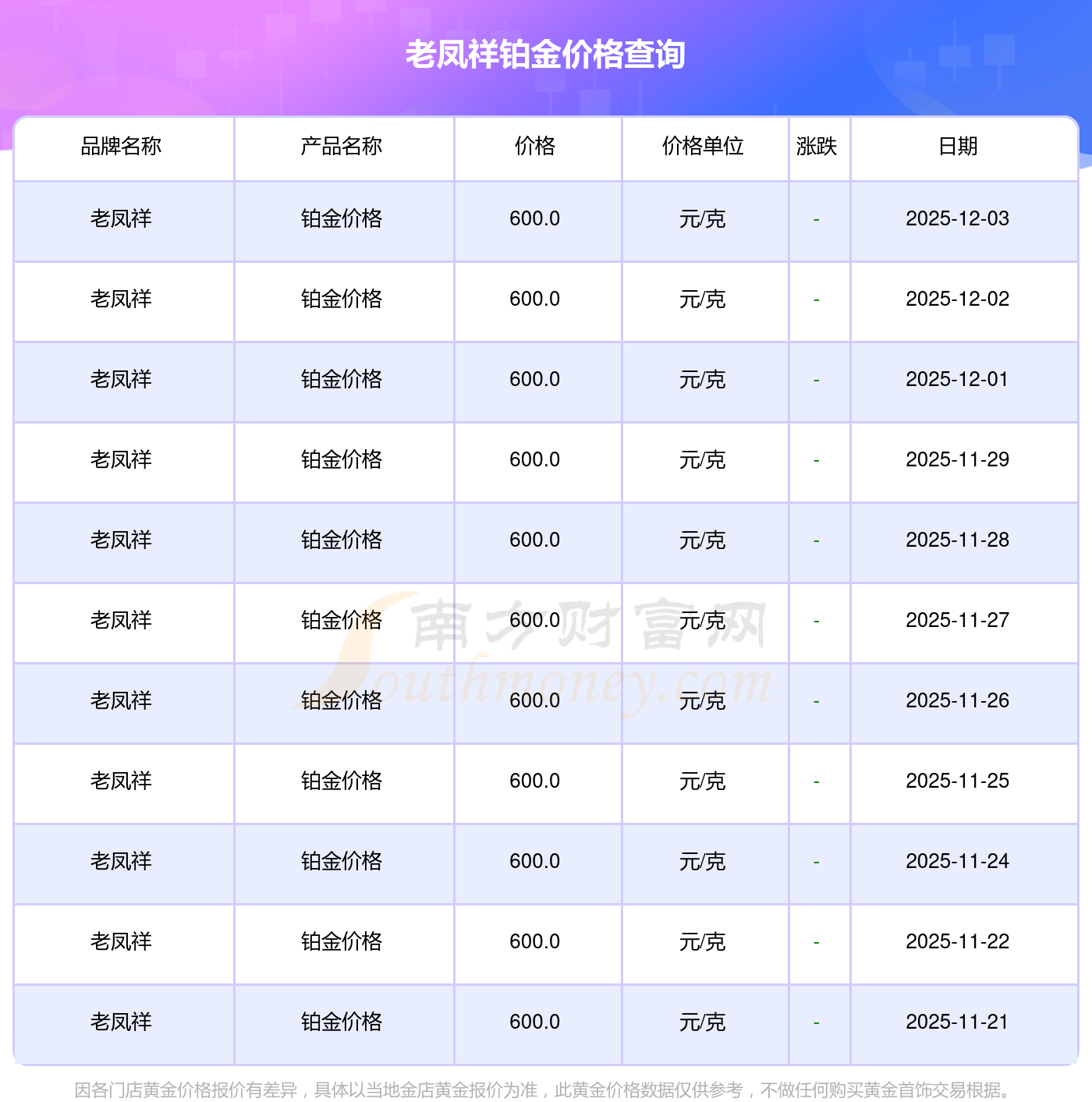今日老鳳祥 鉑金價(jià)格,最新確定為600.0元/克。