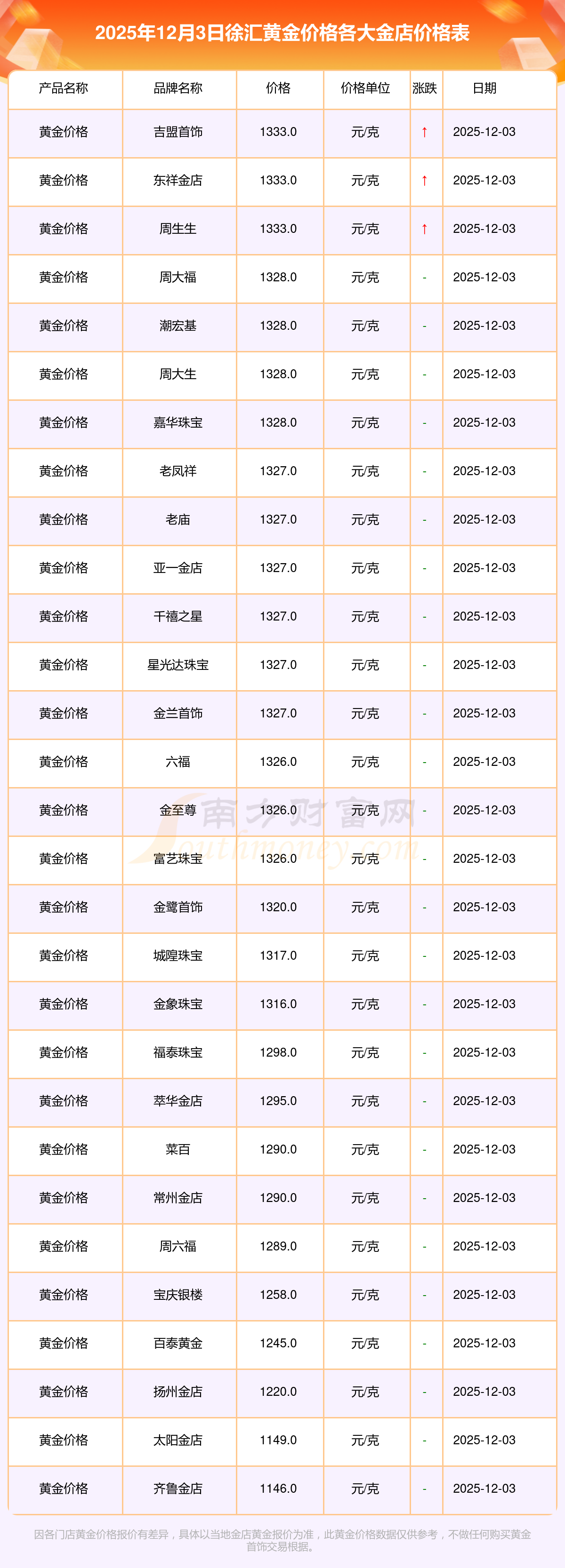 2025年12月3日徐匯各大金店黃金價(jià)格最新價(jià)格查詢來(lái)了:周大福1328.0元/克,周大福663.0元/克,周大福1328.0元/克,周大福46770.0,周大福18990.0,周大福42190.0,周大福1165.0元/克,老鳳祥1327.0元/克,老鳳祥600.0元/克,老鳳祥1327.0元/克,六福1326.0元/克。