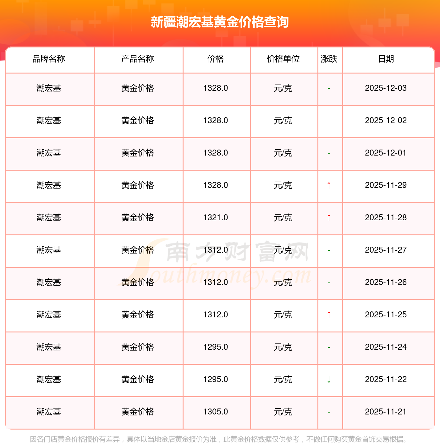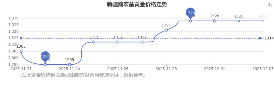 今日(2025年12月3日),新疆潮宏基黃金價格的定價為 1328.0元/克。
