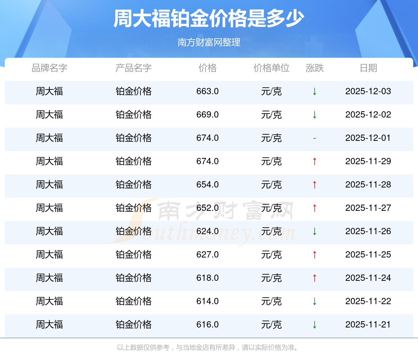2025年12月3日周大福鉑金價(jià)格:663.0元/克。