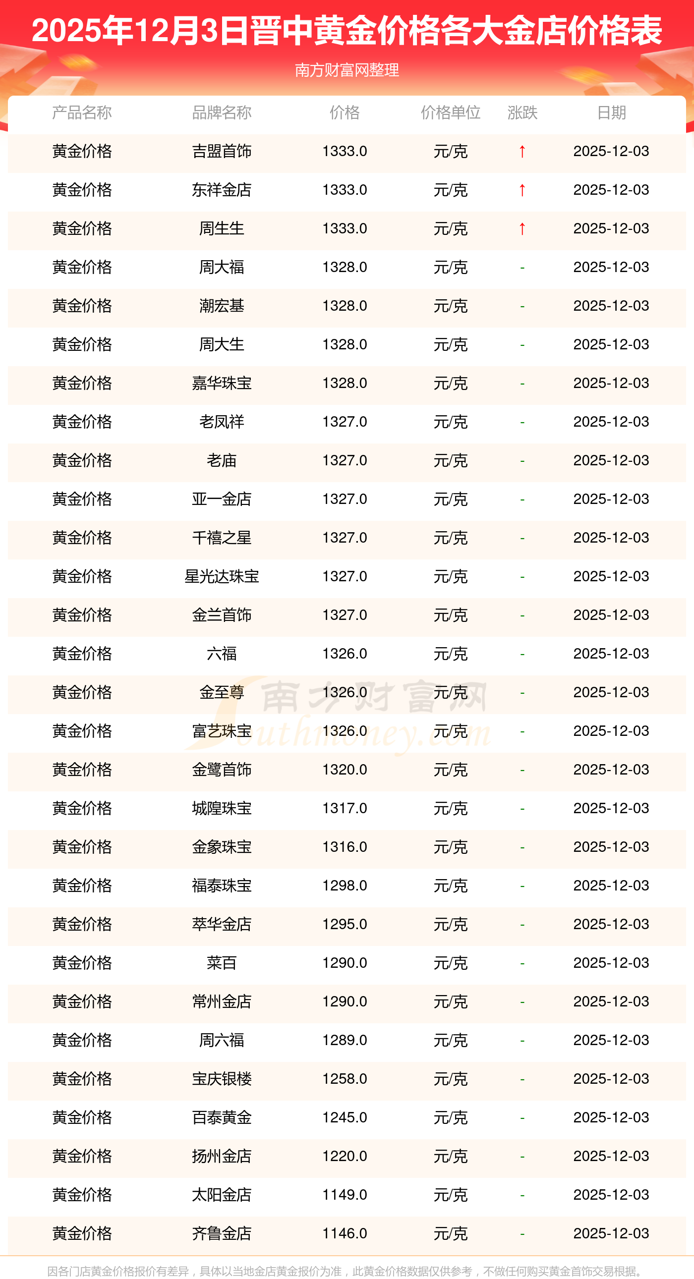 2025年12月3日,晉中周大福、周大福、周大福、周大福、周大福、周大福、周大福、老鳳祥、老鳳祥、老鳳祥、六福等各大金店品牌黃金價格今日價格如下:周大福1328.0元/克、周大福663.0元/克、周大福1328.0元/克、周大福46770.0、周大福18990.0、周大福42190.0、周大福1165.0元/克、老鳳祥1327.0元/克、老鳳祥600.0元/克、老鳳祥1327.0元/克、六福1326.0元/克。